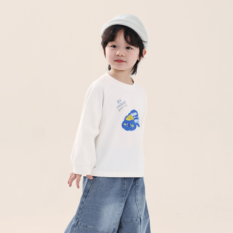 澄んだブルーで描かれた大きなうさぎの顔が、胸元で存在感を放ちます。白い地色に映えるクリアな色合いが、子どもらしい元気さと無邪気さを引き立てます。