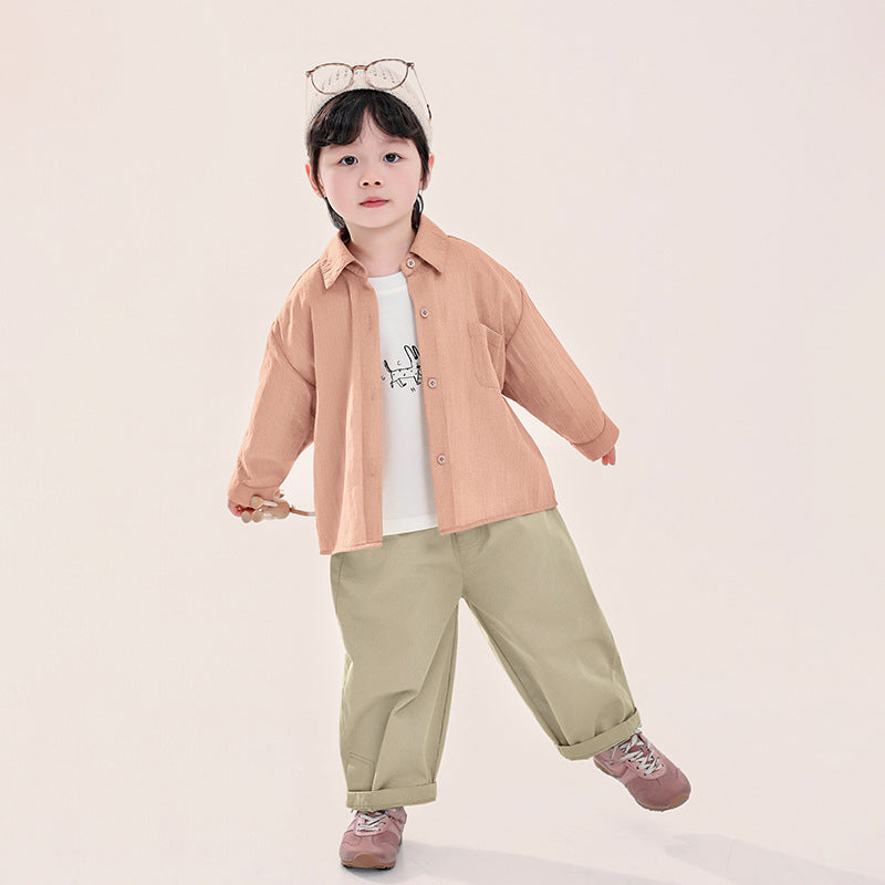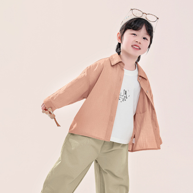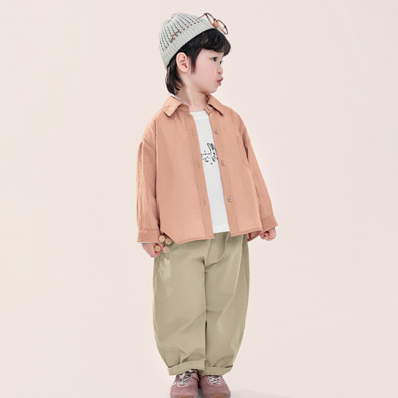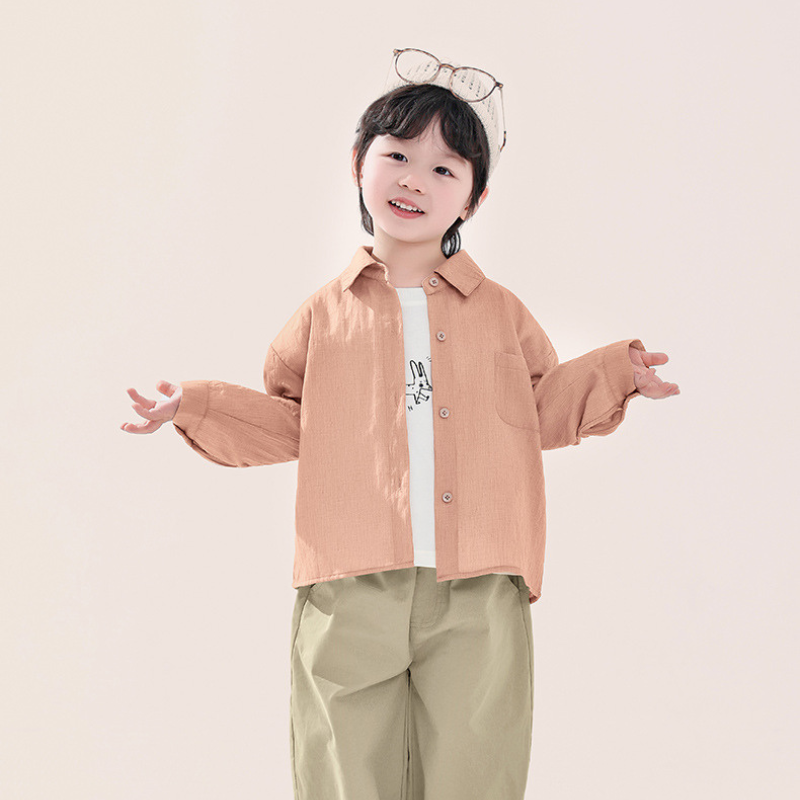 淡く温もりを感じるライトオレンジが、男の子の爽やかさを引き立てます。主張しすぎない色合いが、春の装いに自然な彩りを添えます。