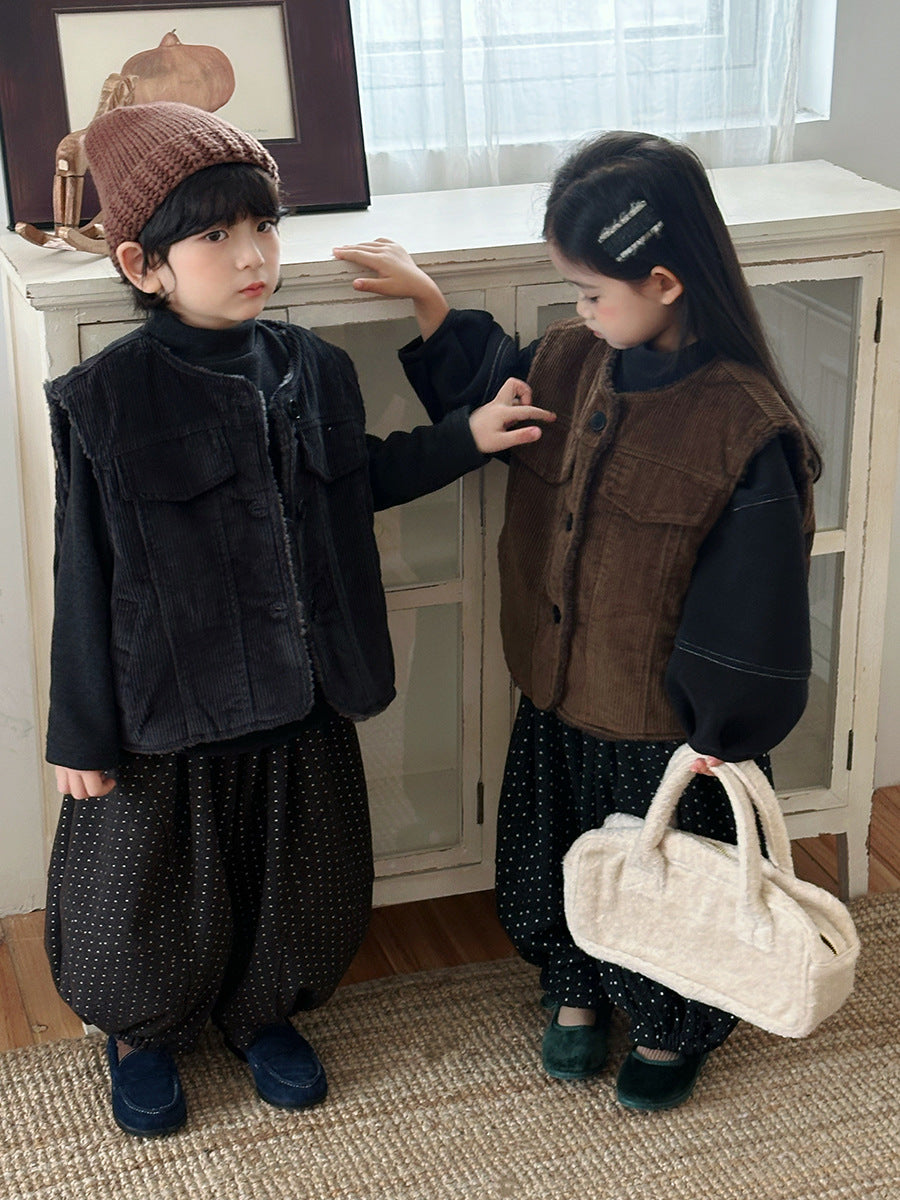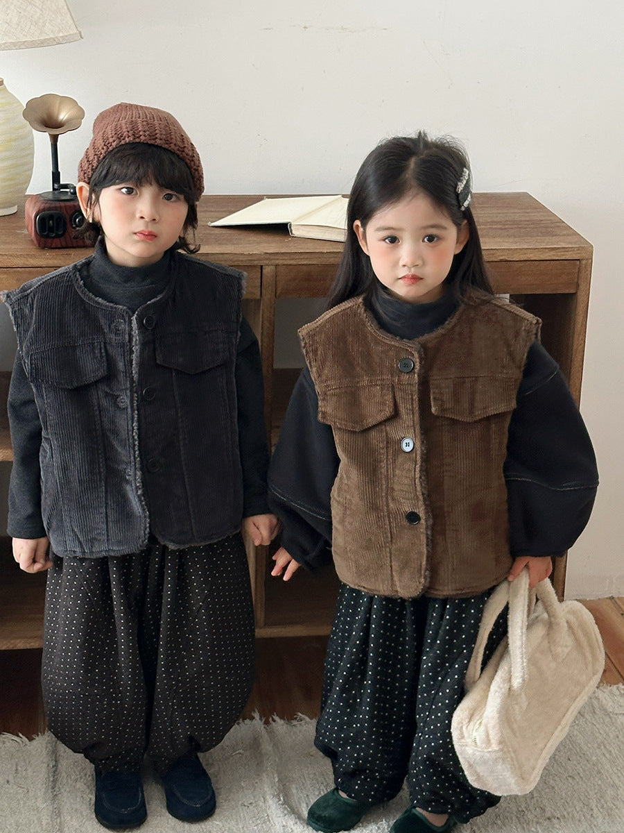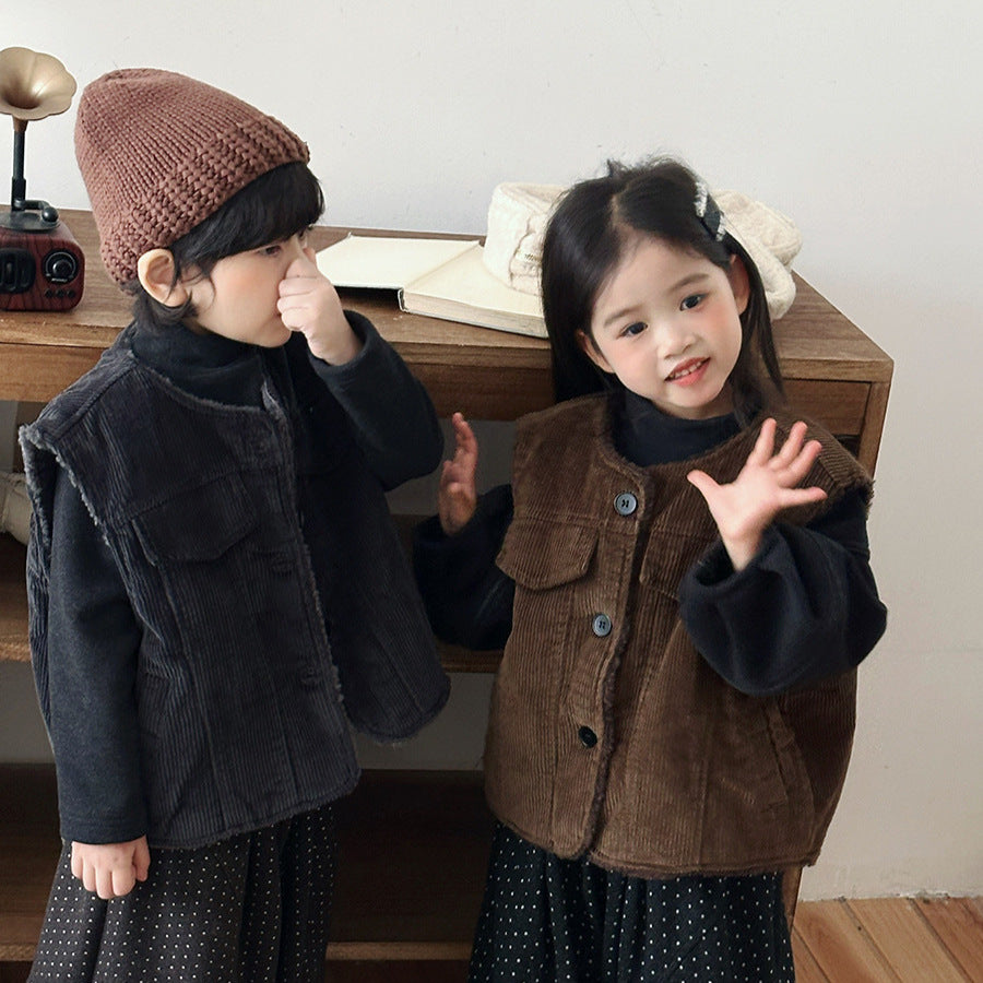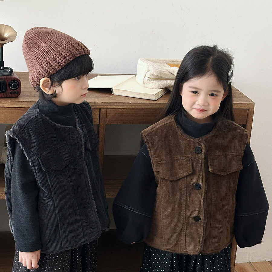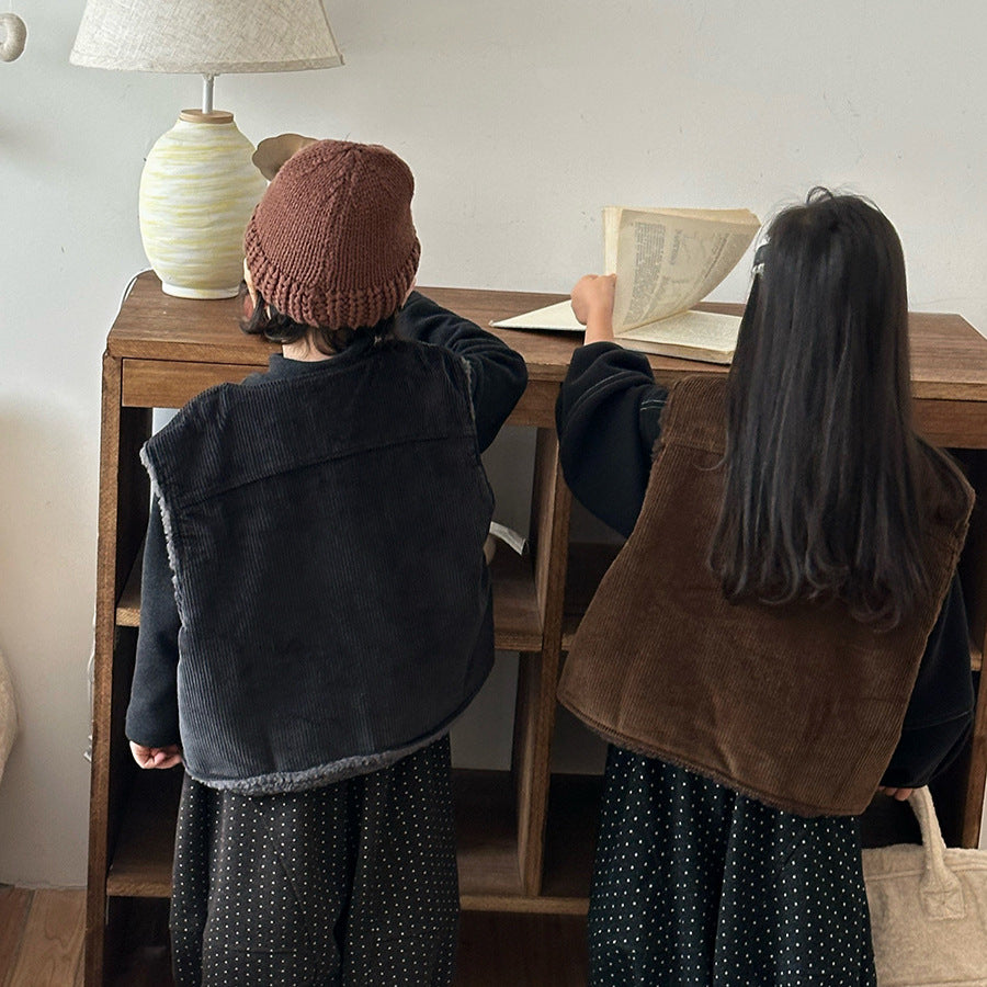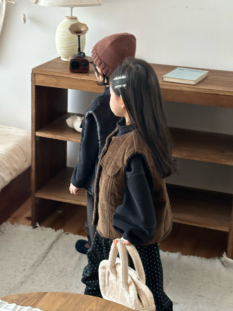 外側はビンテージ感のある厚手コーデュロイ、内側は暖かなボアファーでユニセックスデザインのベストです。