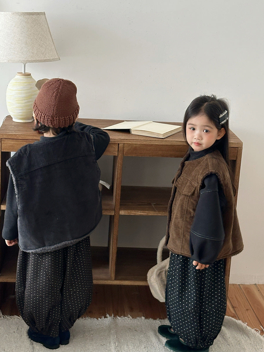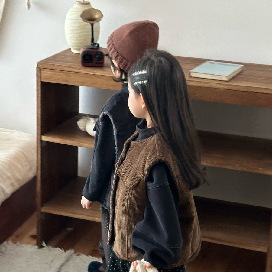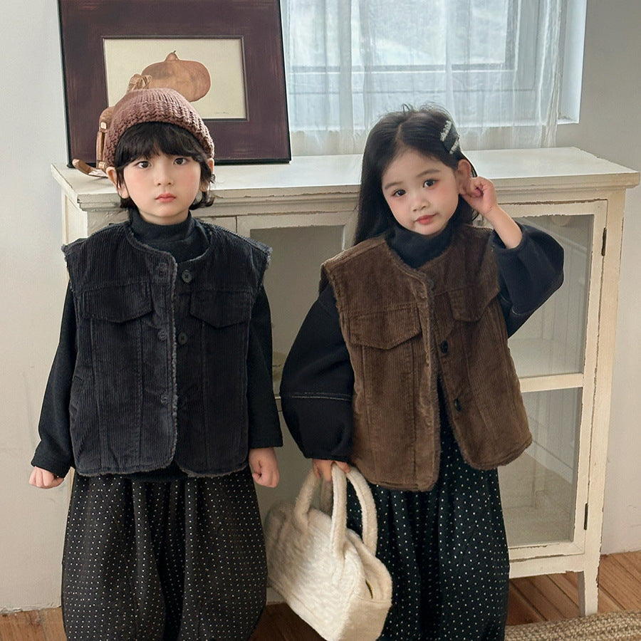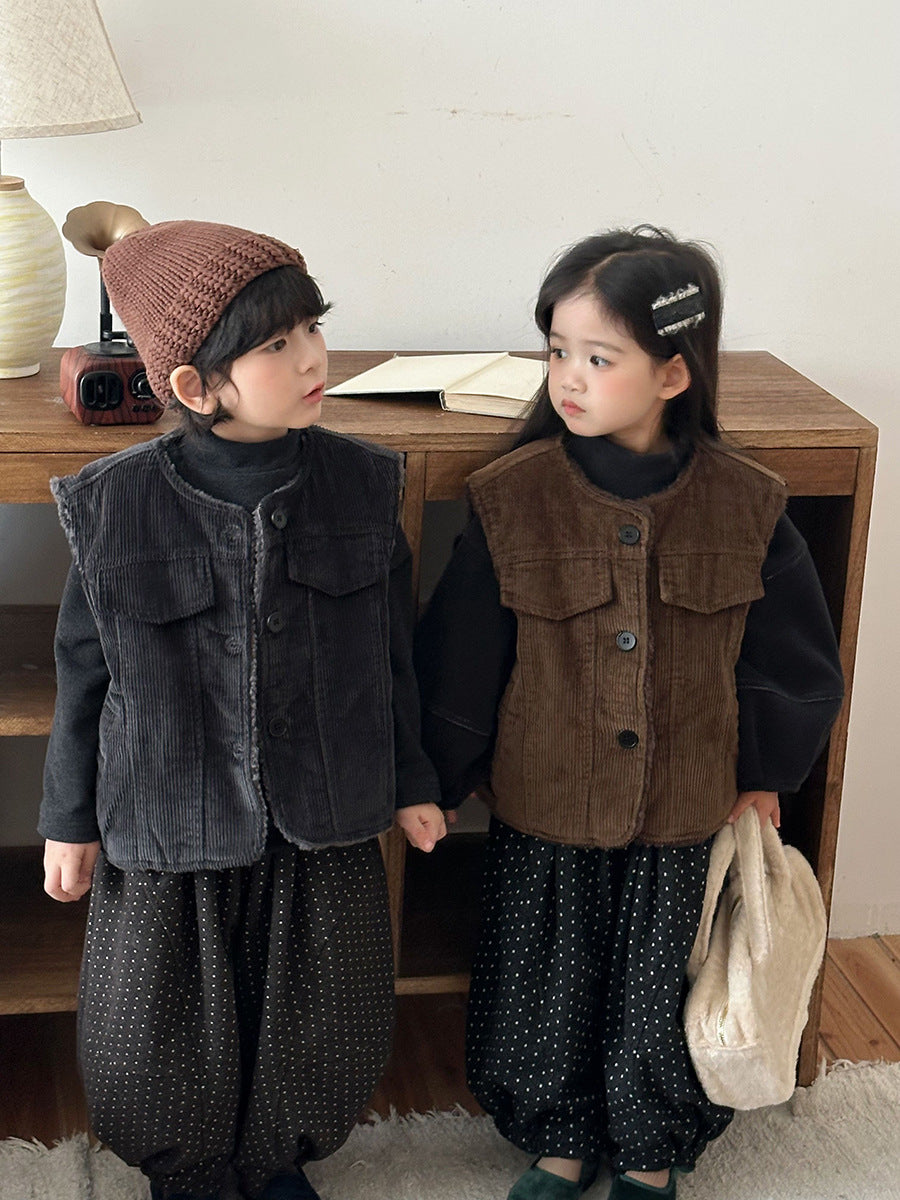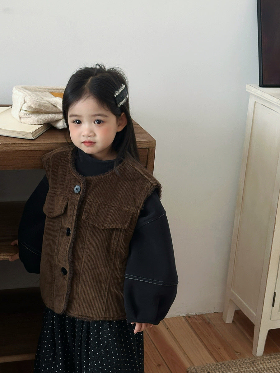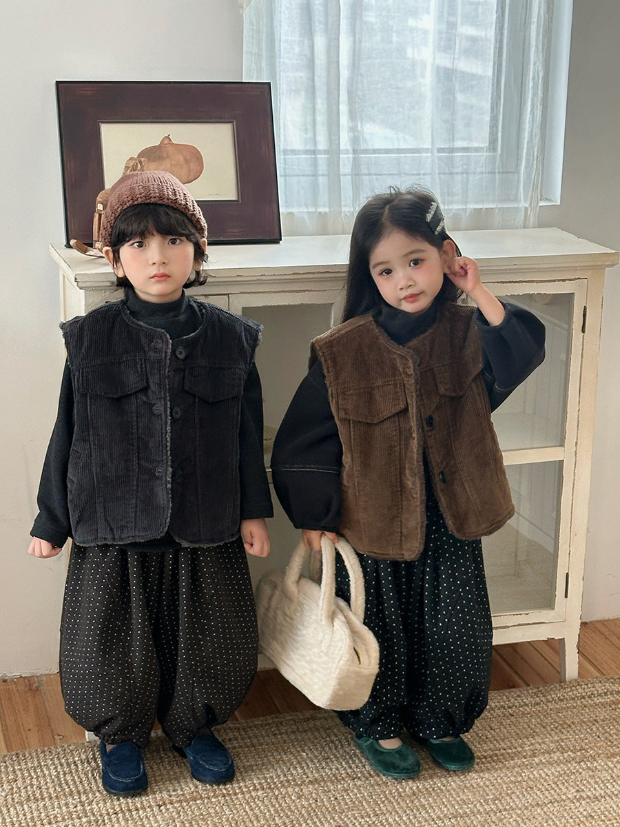 外側はビンテージ感のある厚手コーデュロイ、内側は暖かなボアファーでユニセックスデザインのベストです。