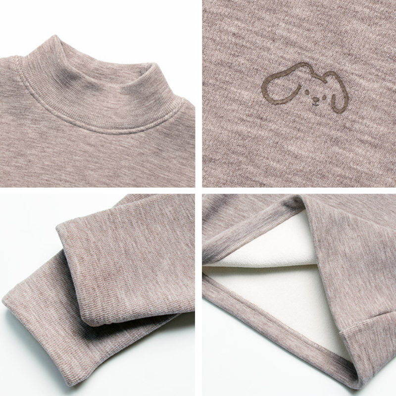 胸元に小さくあしらわれたワンちゃんのプリントが、上品で可愛らしい印象を叶える裏極細ボアインナー。