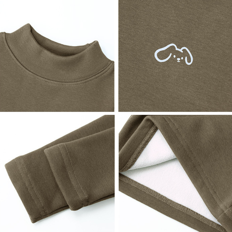 胸元に小さくあしらわれたワンちゃんのプリントが、上品で可愛らしい印象を叶える裏極細ボアインナー。