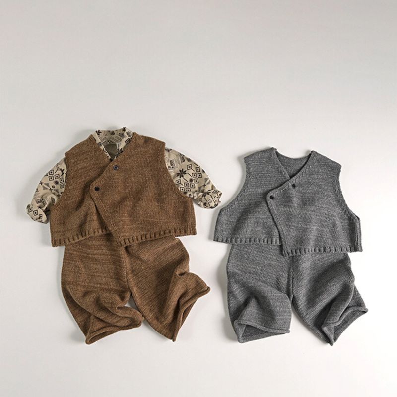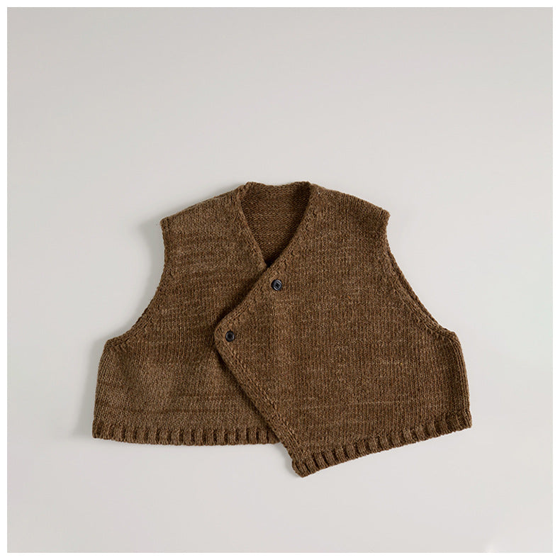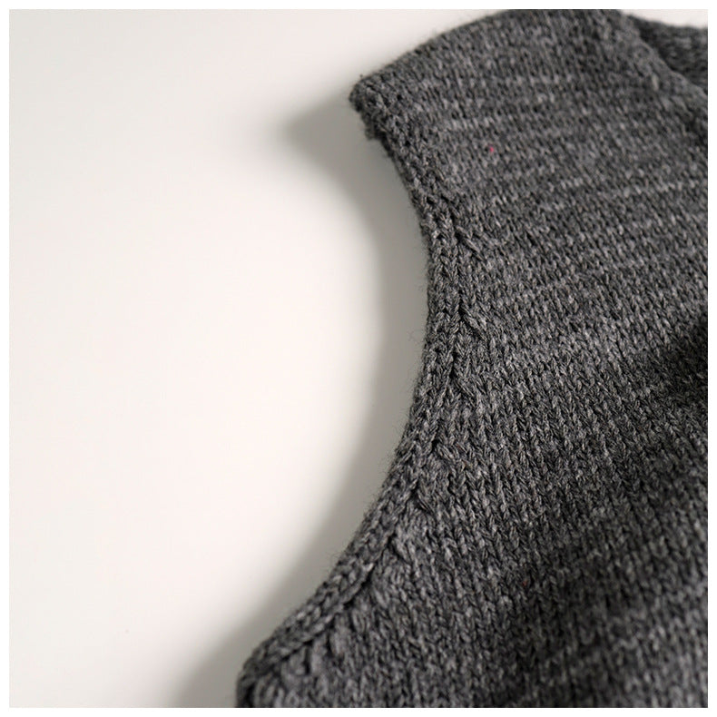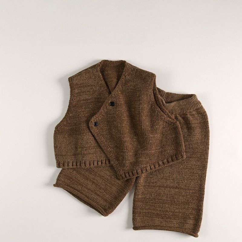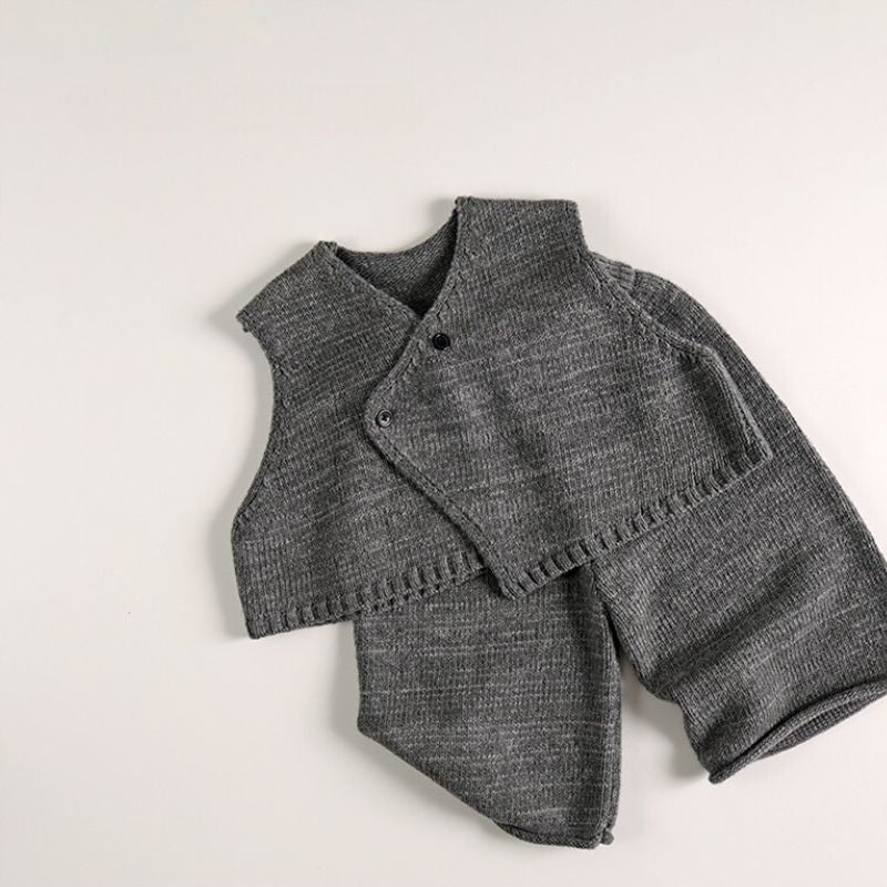 アシメトリーデザインが目を引くニットベストセットアップ。