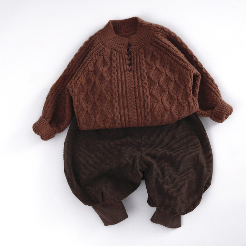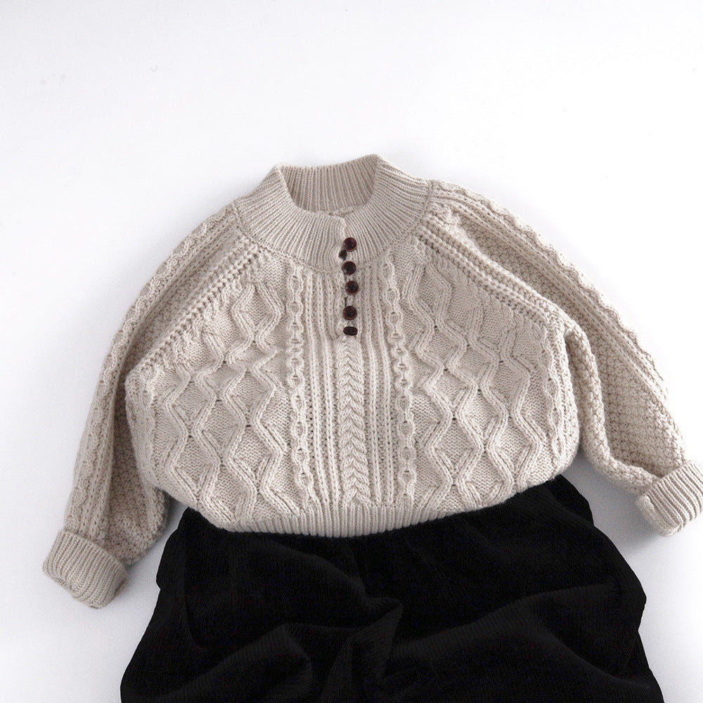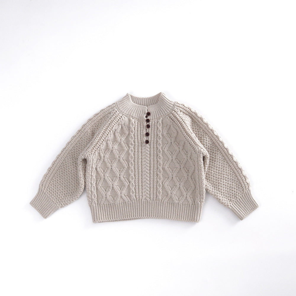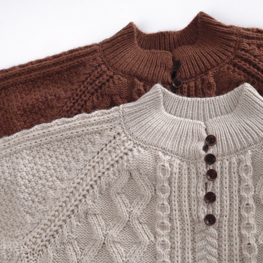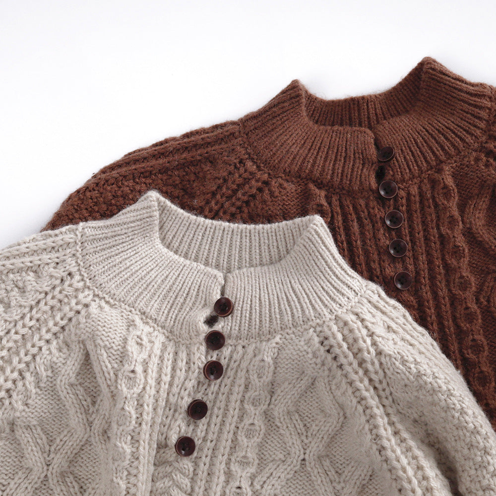 こだわりが詰まった一枚。ケーブル編みとハーフボタンが特徴的のハイネックニット。