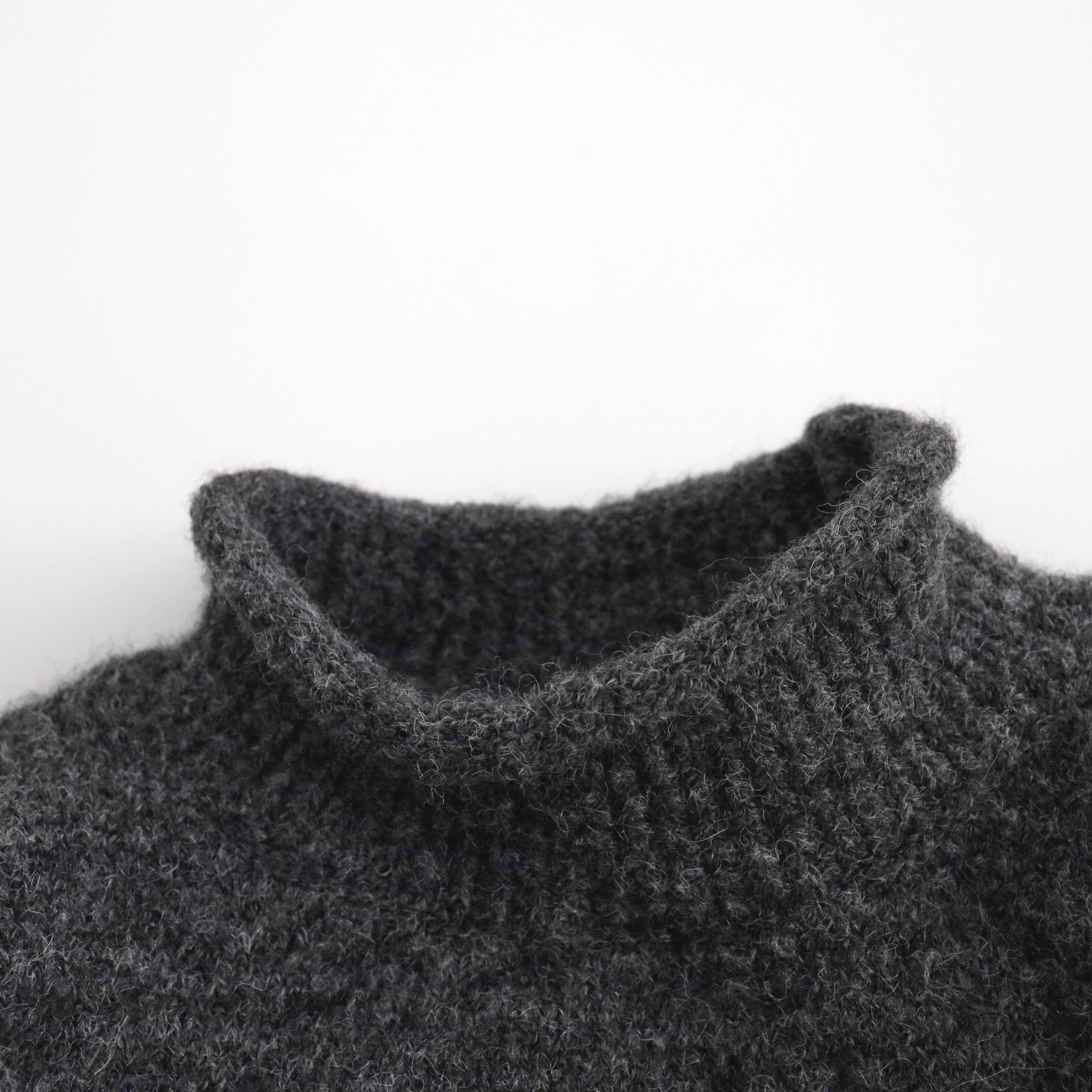 寒い日も首元までしっかり包み込む、ほっこり高めの襟が特徴のニットセーター。