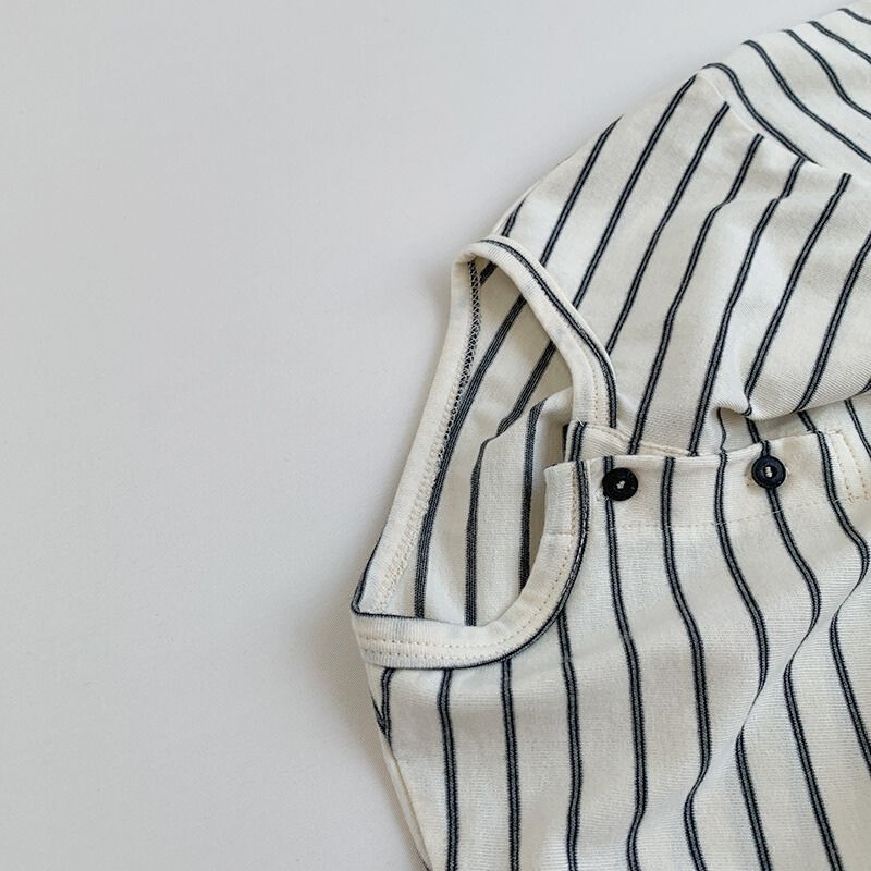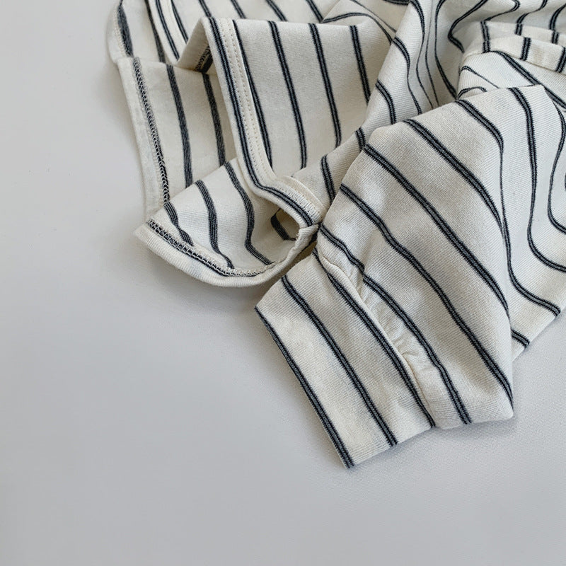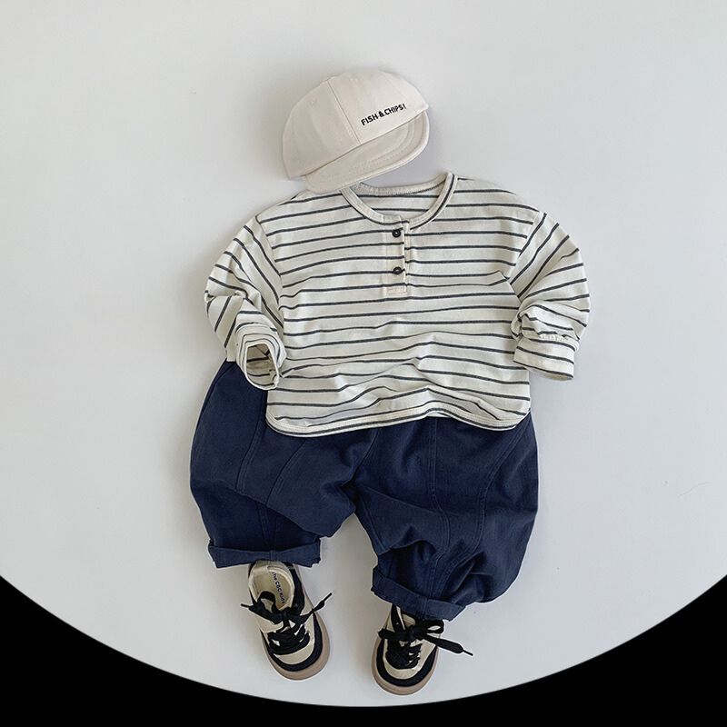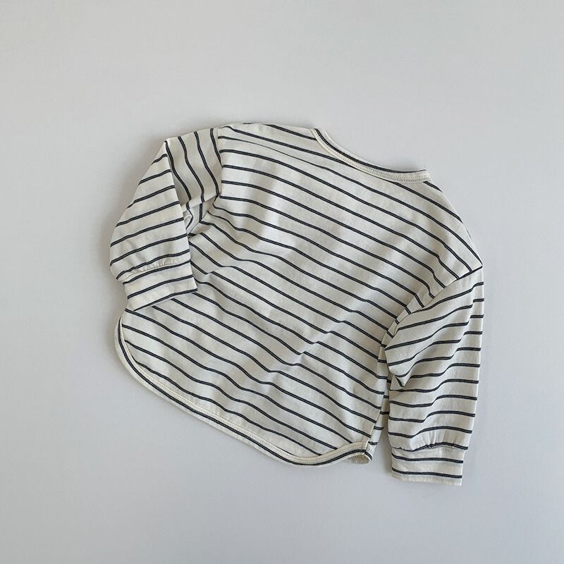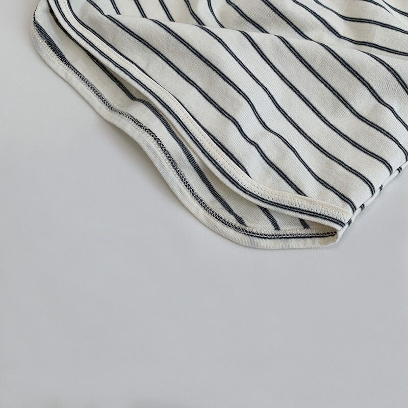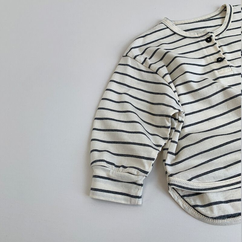 ダブルボタンがポイントになる、爽やかで清潔感ある白ベースのモノトーンボーダーロングTです。