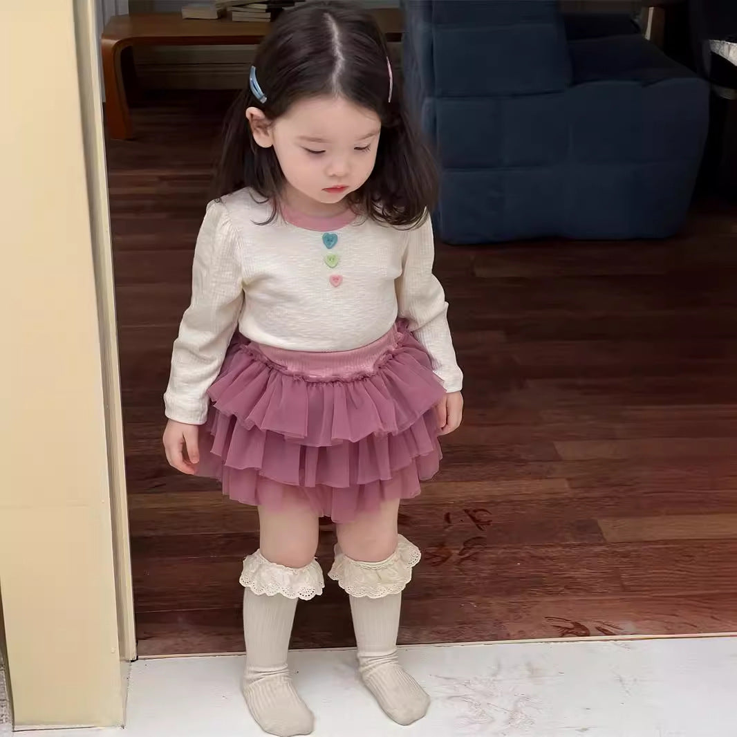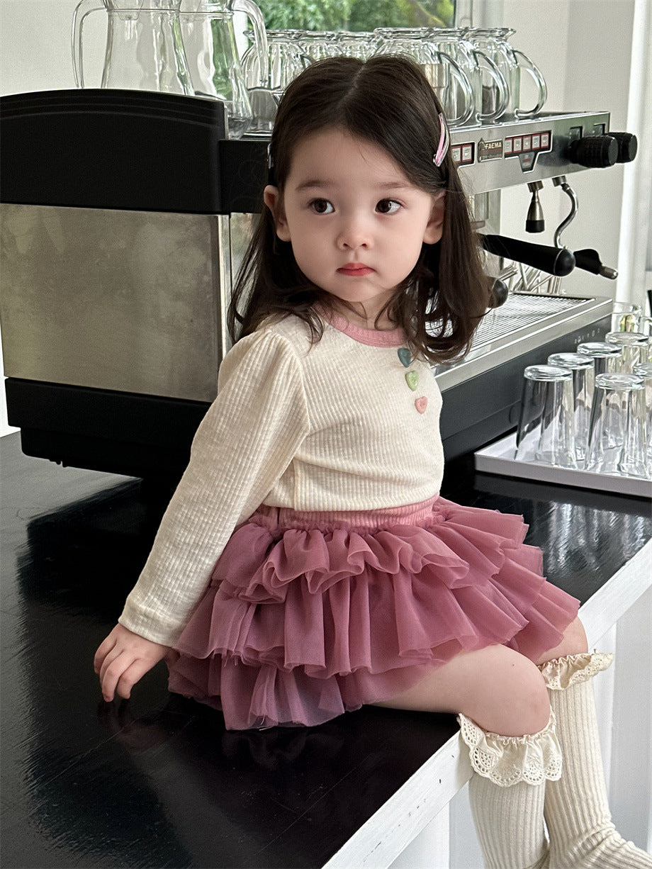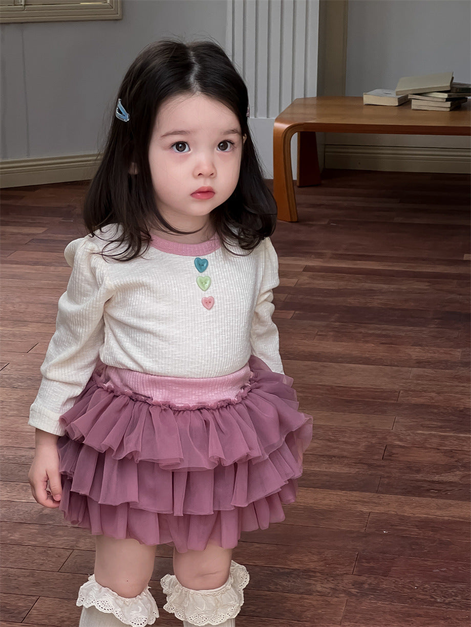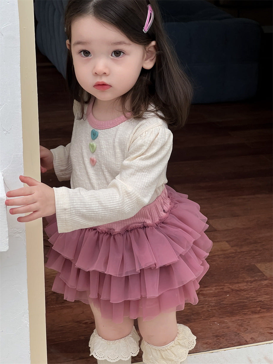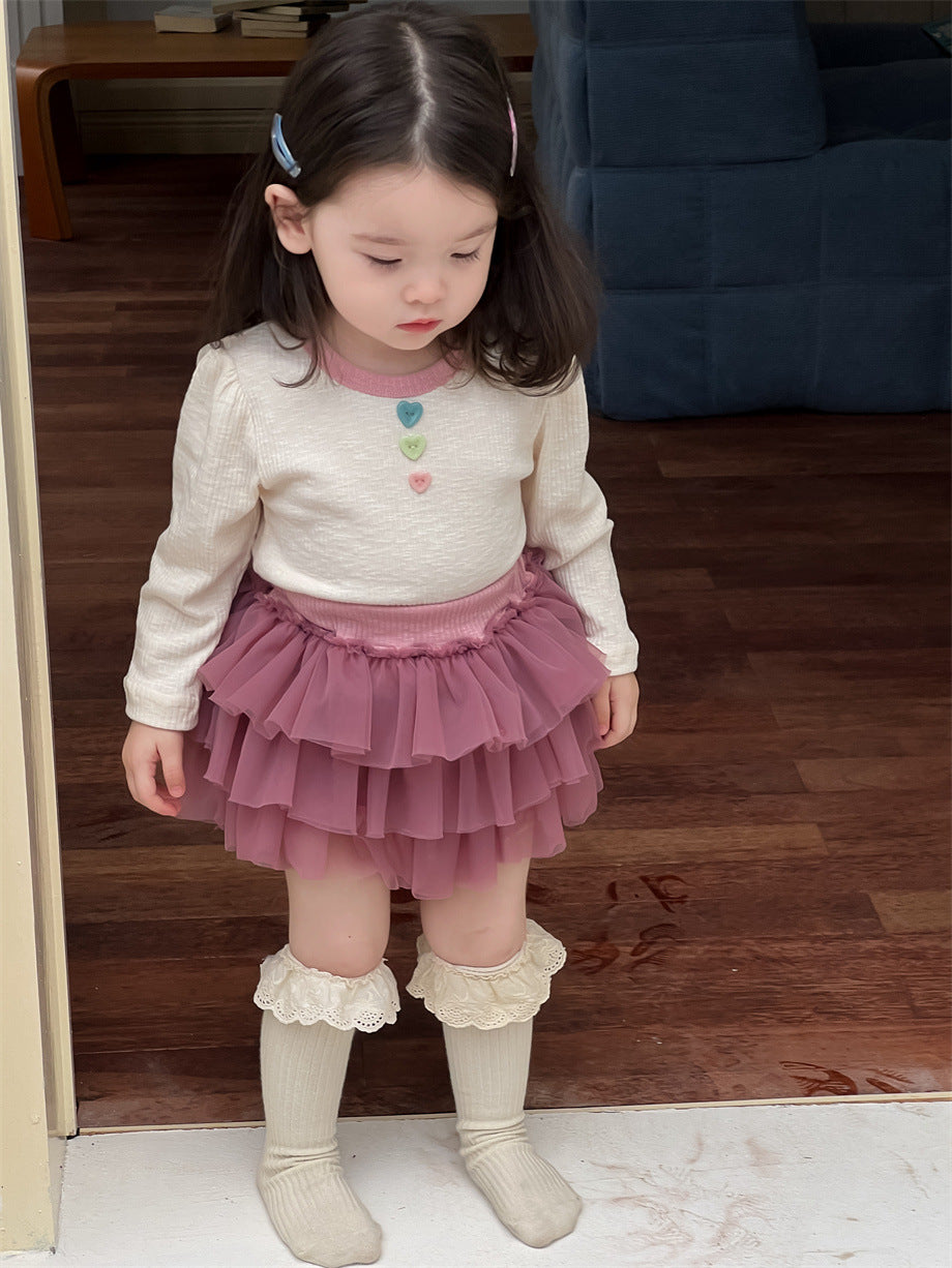 トップス部分は柔らかく伸縮性抜群のテレコ素材、ハートデザインのボタンがついており、かわいいアクセントに。