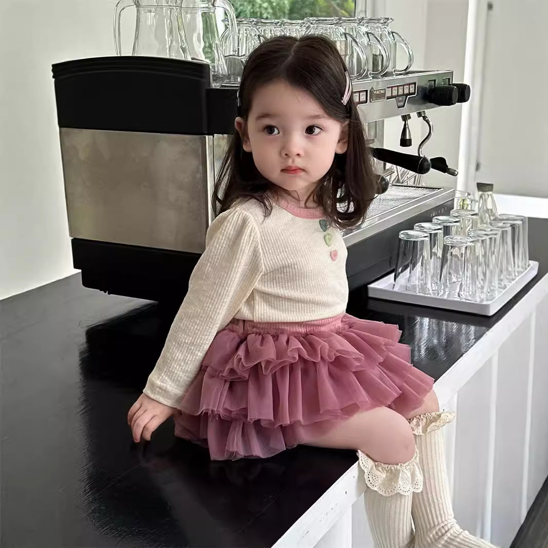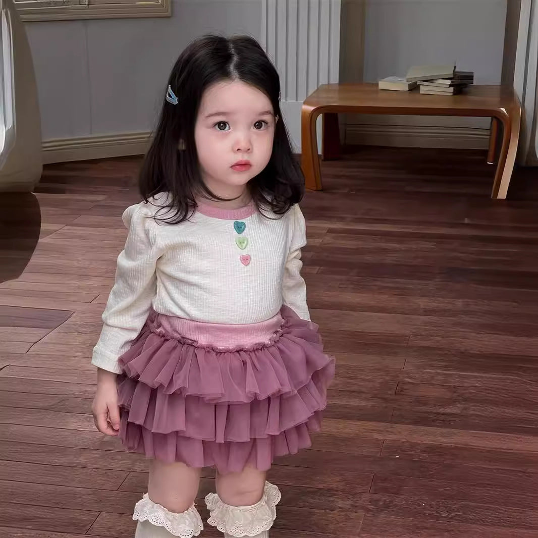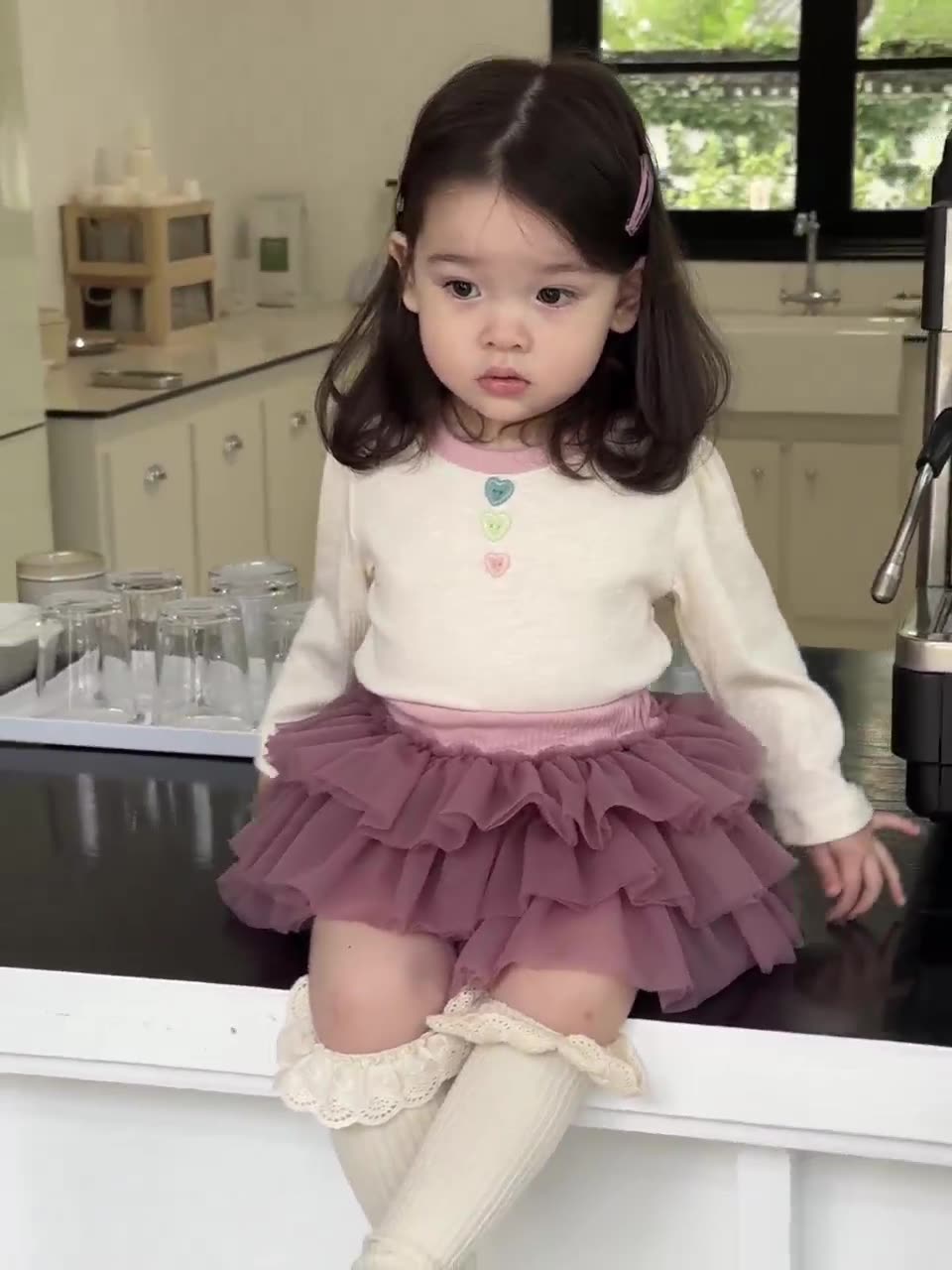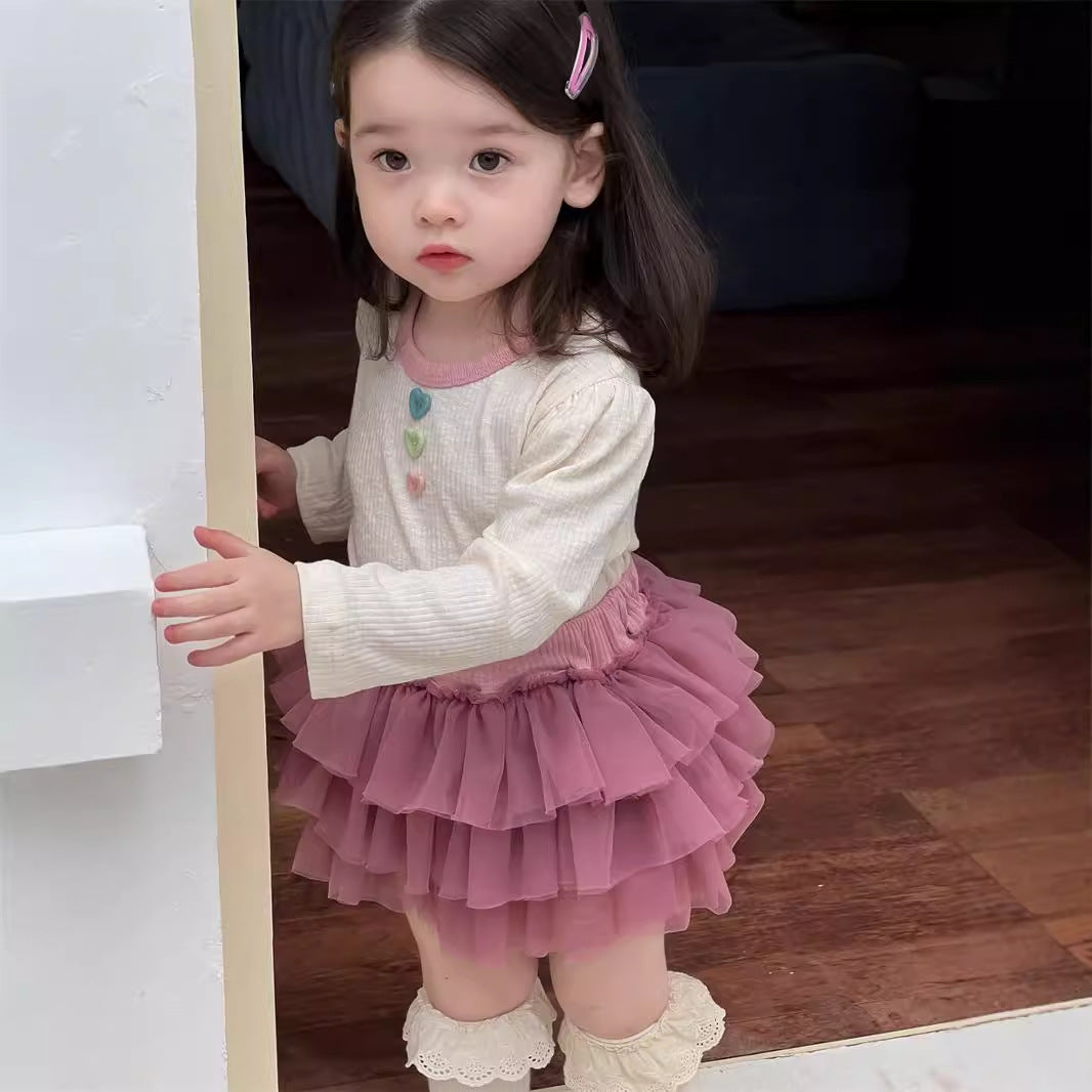 トップス部分は柔らかく伸縮性抜群のテレコ素材、ハートデザインのボタンがついており、かわいいアクセントに。