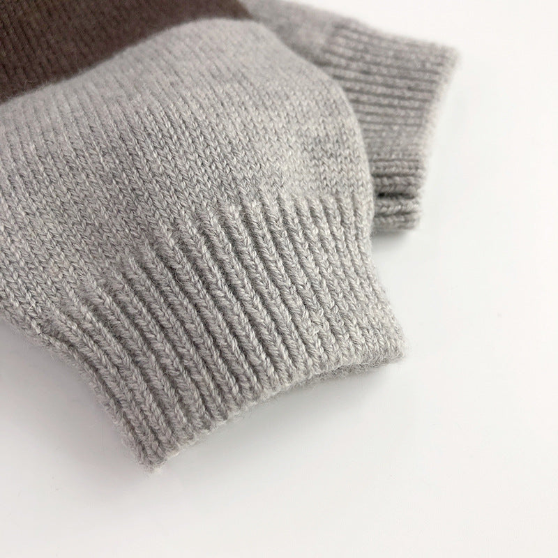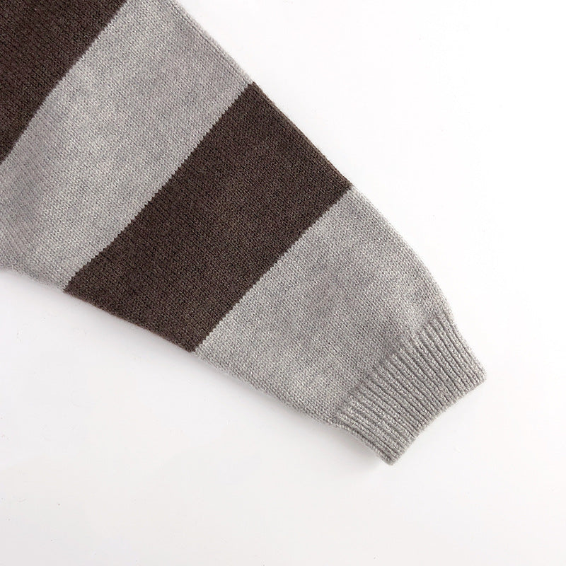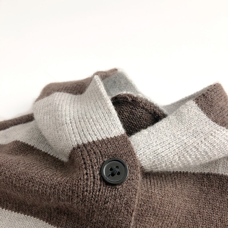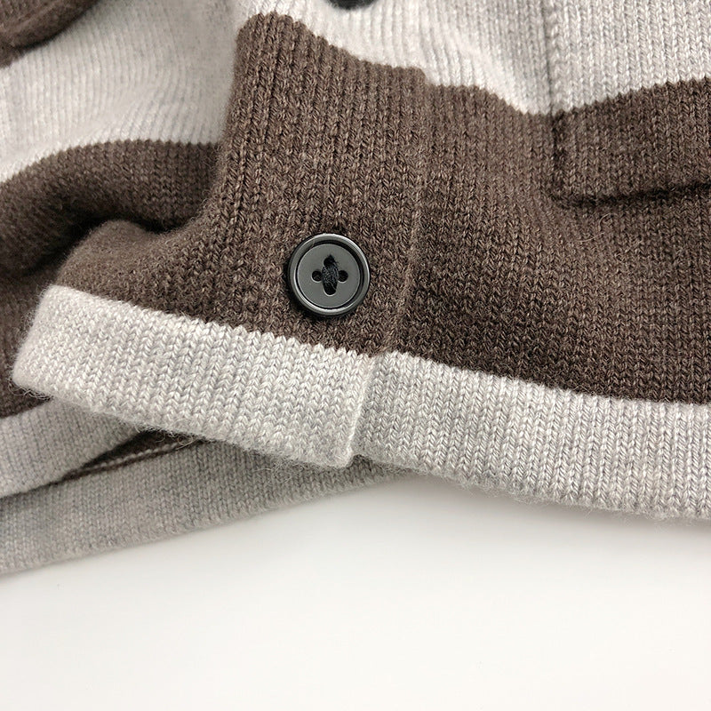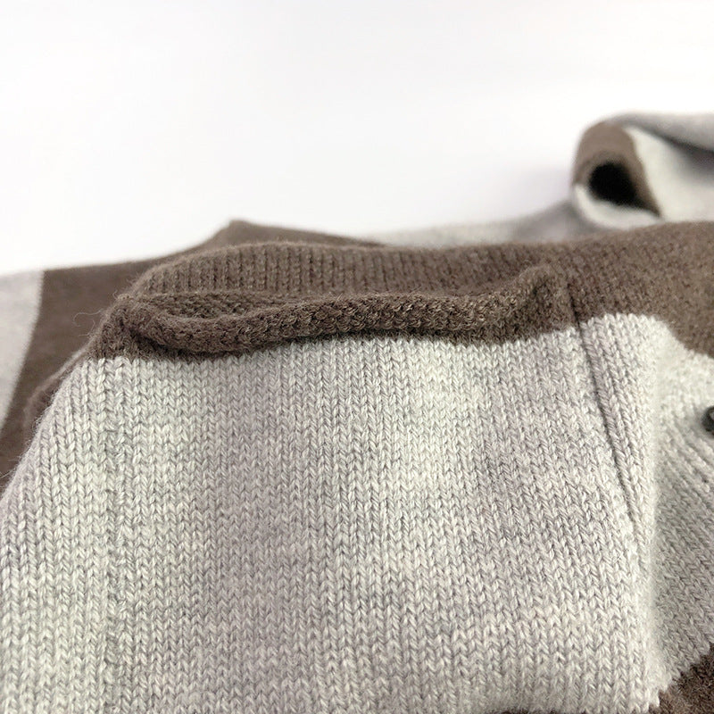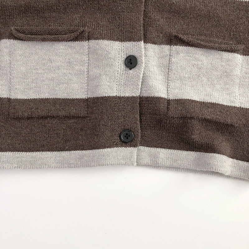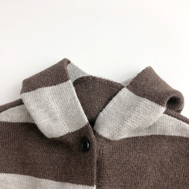 しっかり厚みのある編立てのニットとポンポン付き三角フードが可愛いボーダーパーカーです。