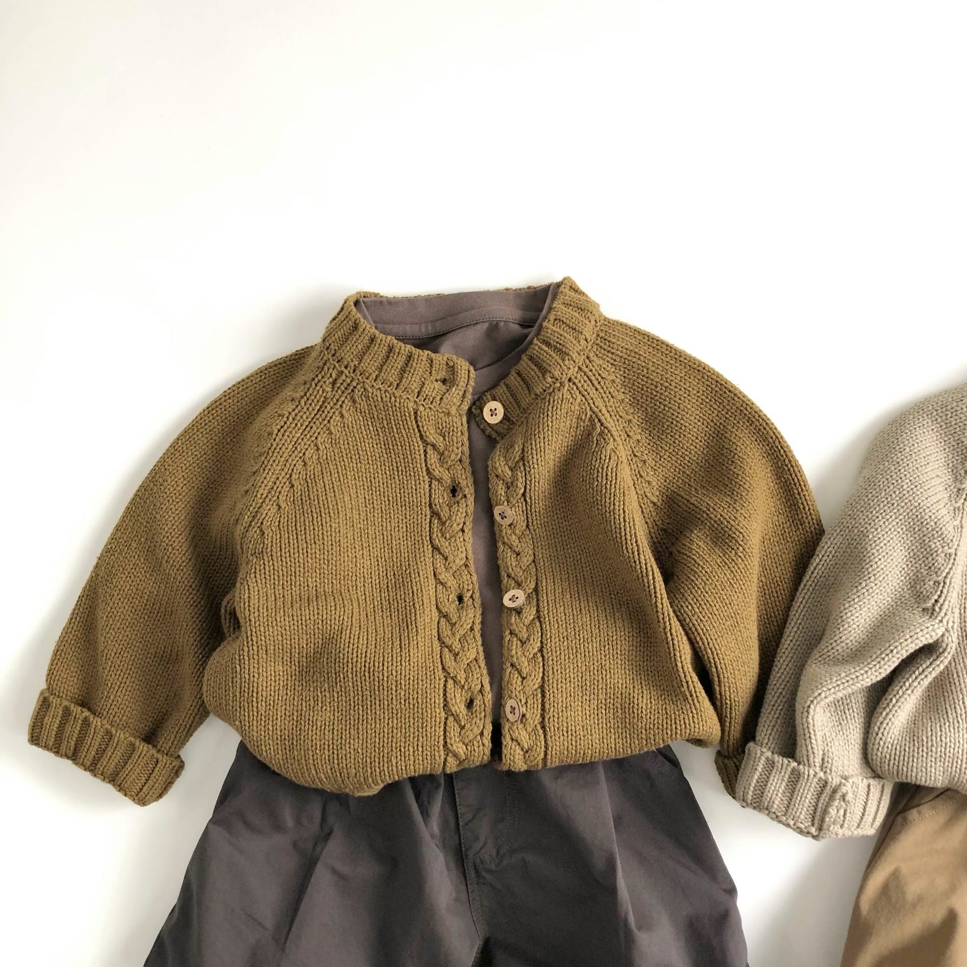 前立て部分に、太く立体的なケーブル編みのデザインを配した、存在感のあるニットカーディガンです。