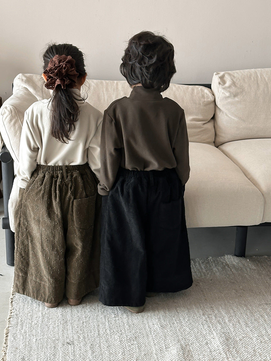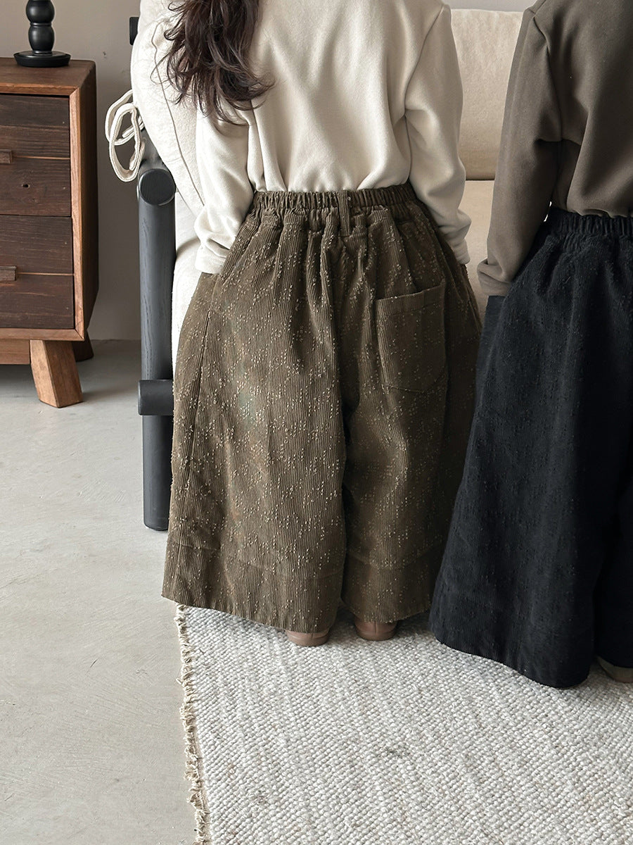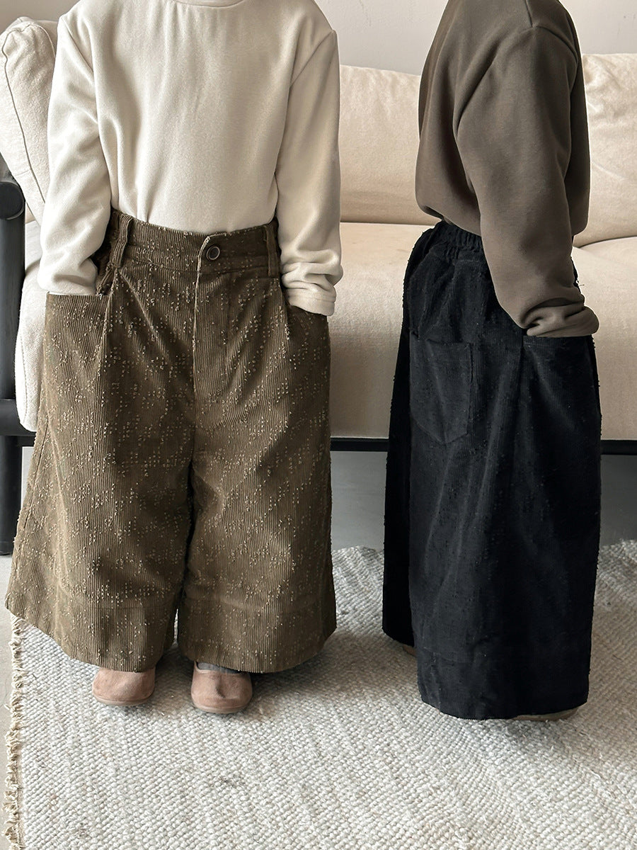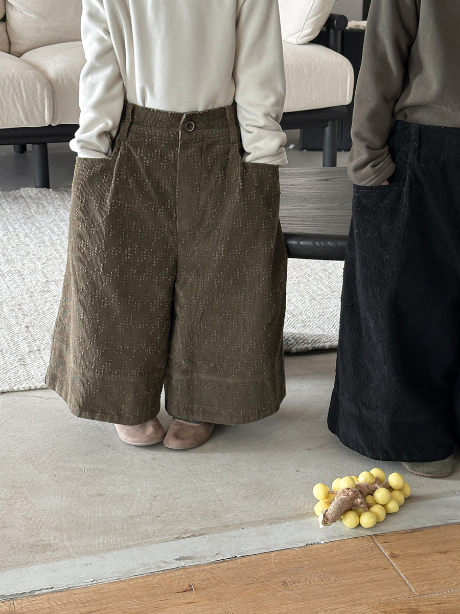 全身に施された繊細な穴あき模様は、唯一無二のプリント柄となり、小さな個性派におすすめな裏起毛コーデュロイパンツ。