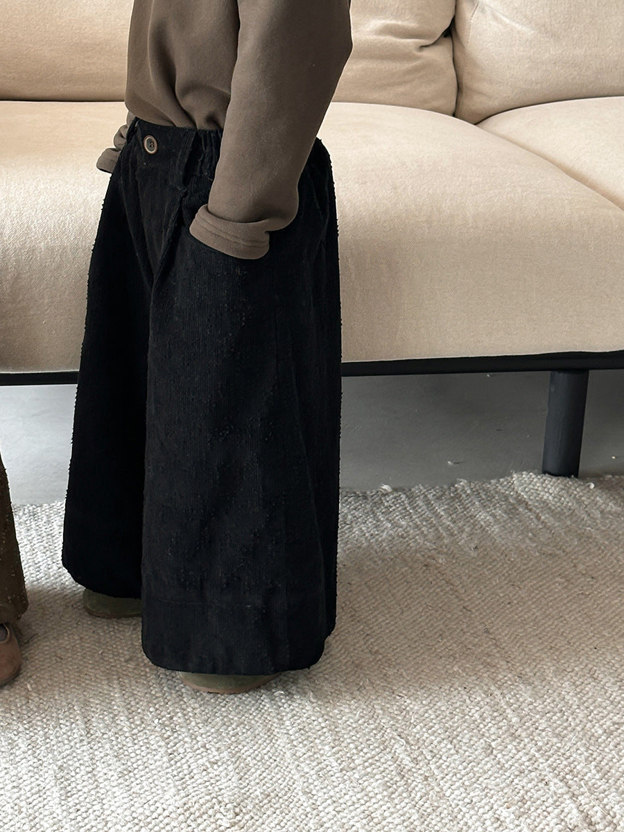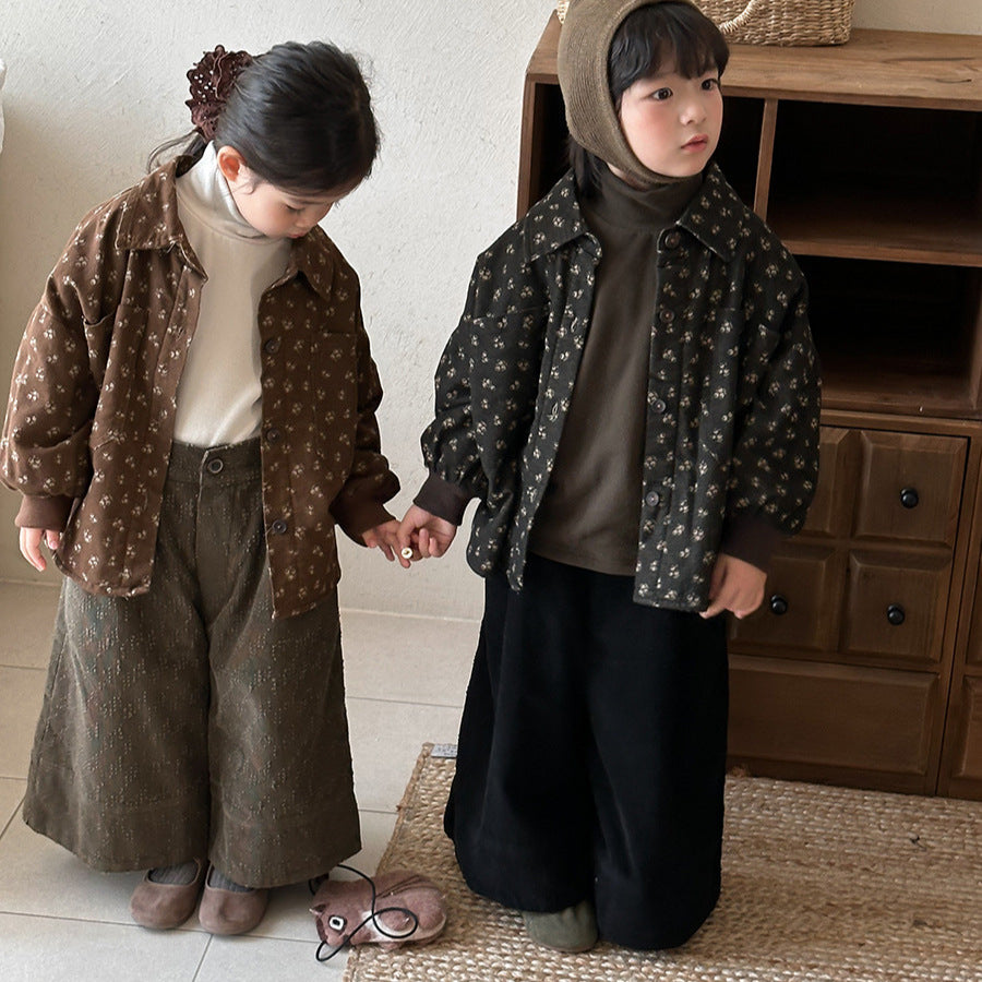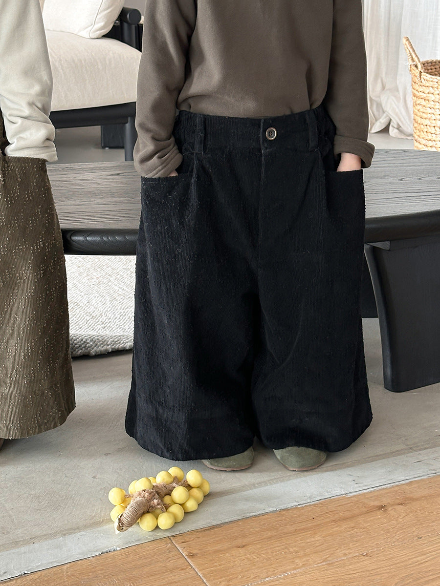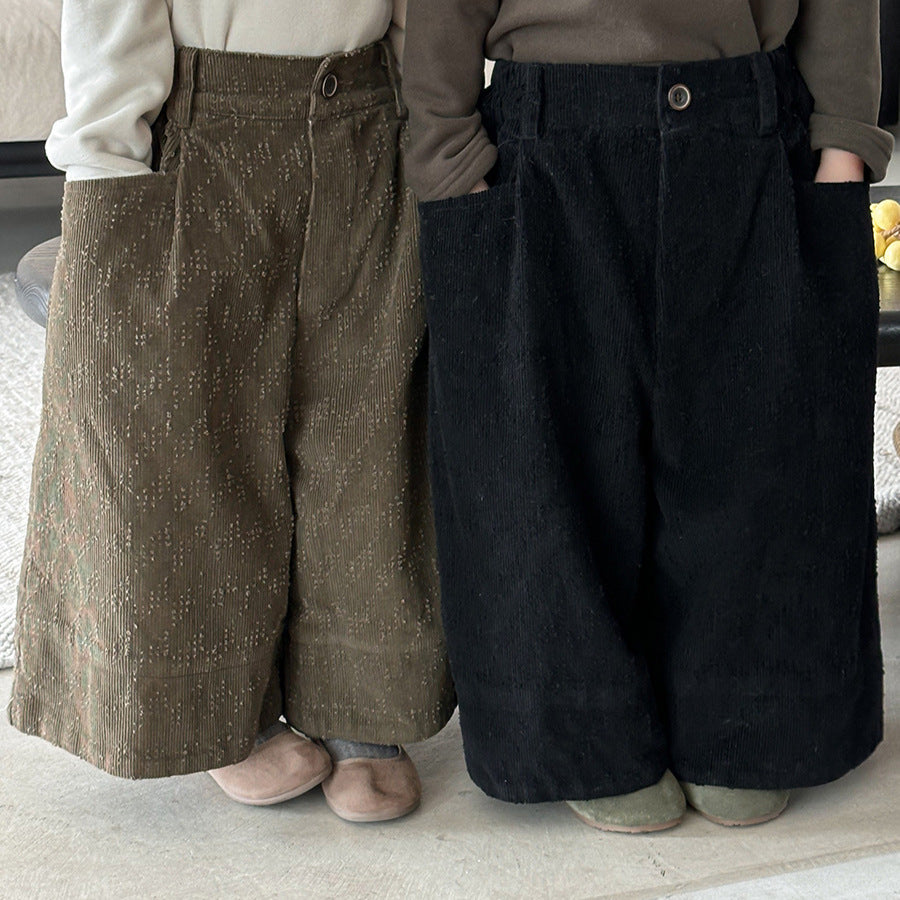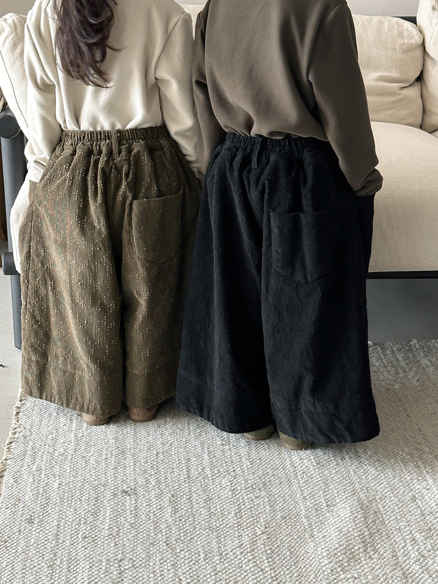 全身に施された繊細な穴あき模様は、唯一無二のプリント柄となり、小さな個性派におすすめな裏起毛コーデュロイパンツ。