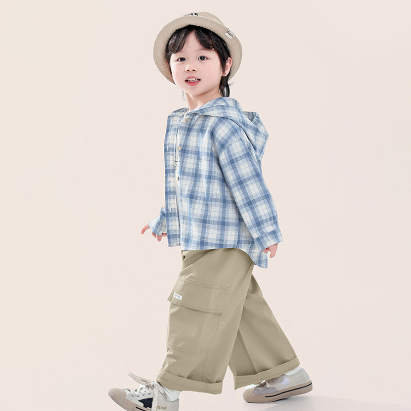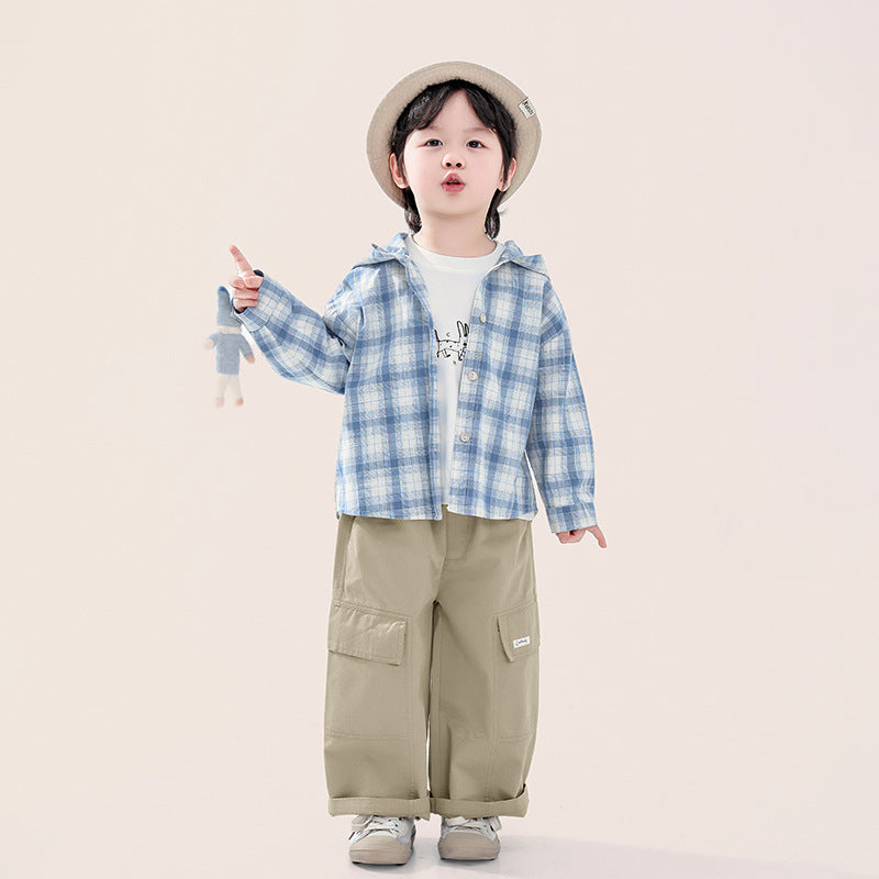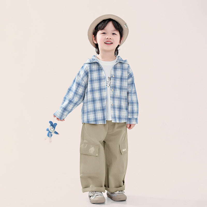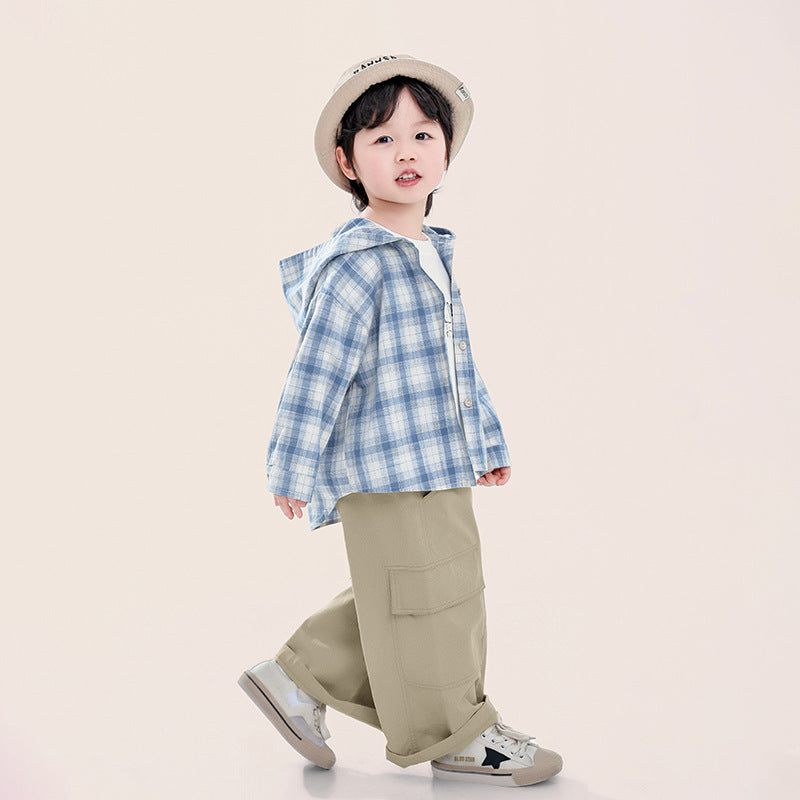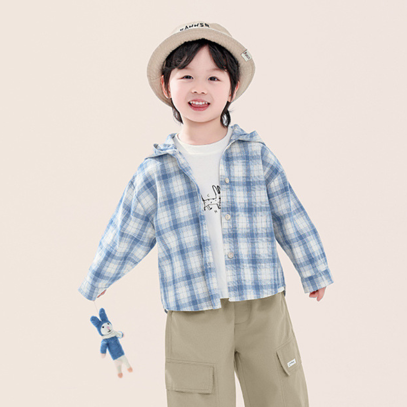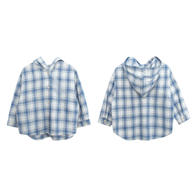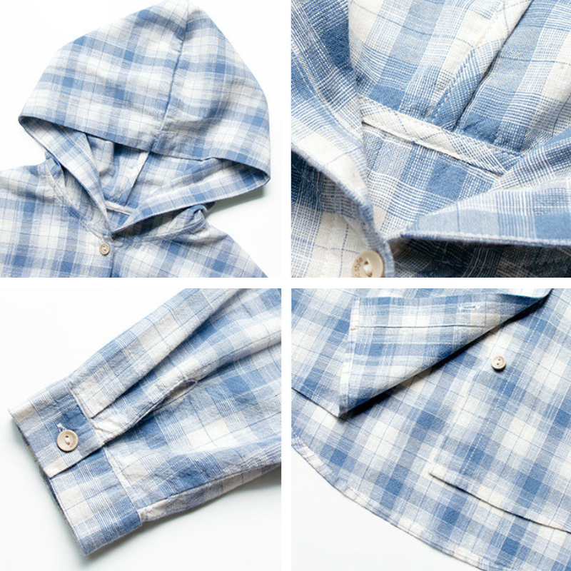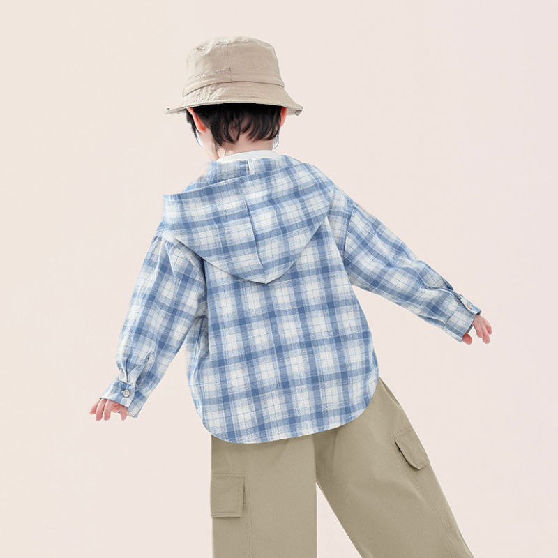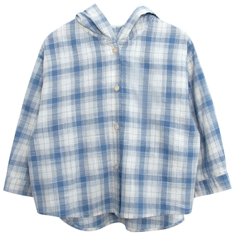 春らしい清潔感あふれるブルー&ホワイトチェックを、肌触りの良い綿100%素材で仕立てたフード付きチェックシャツです。