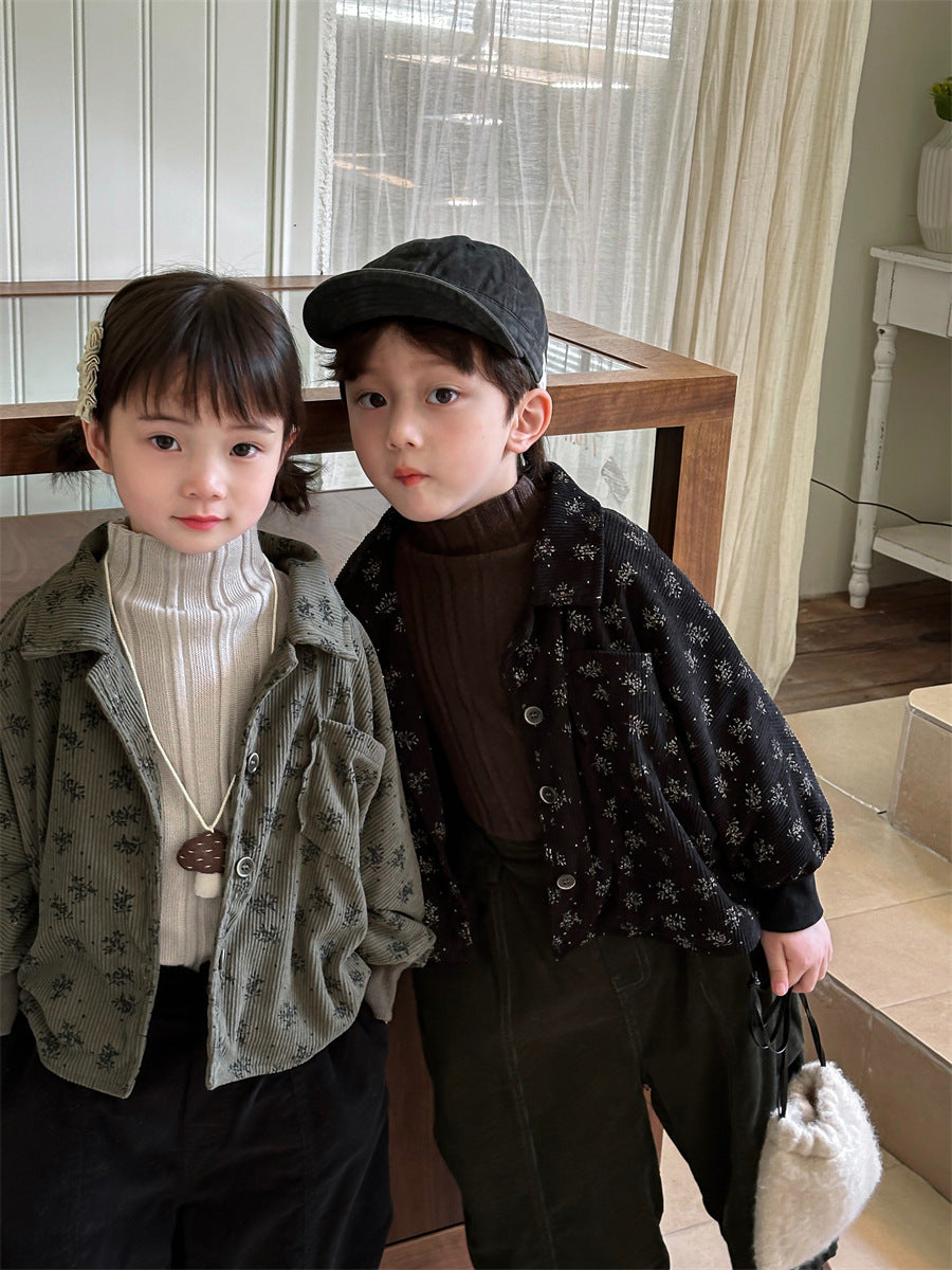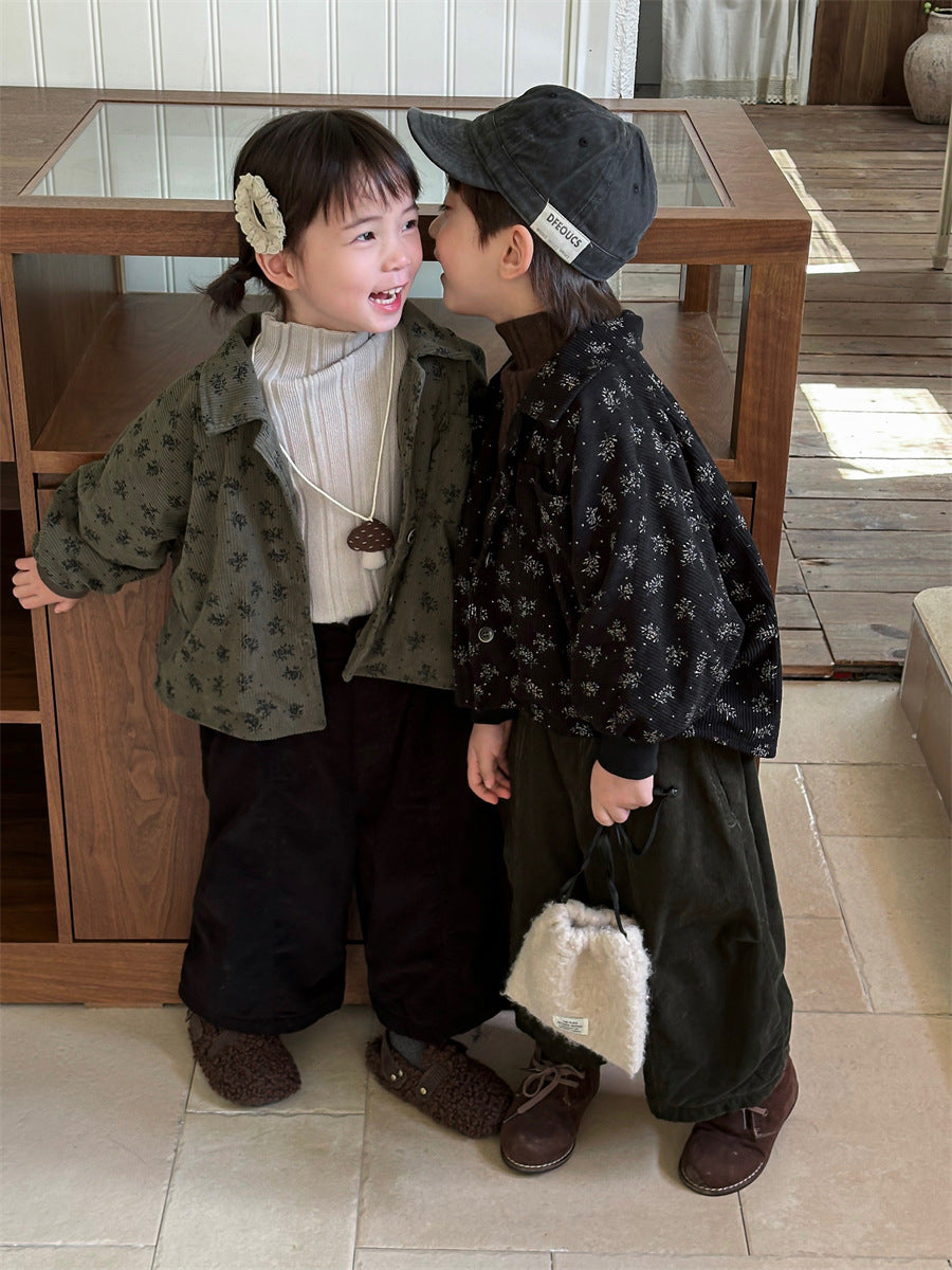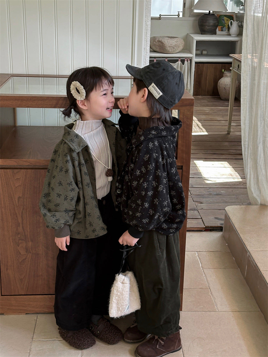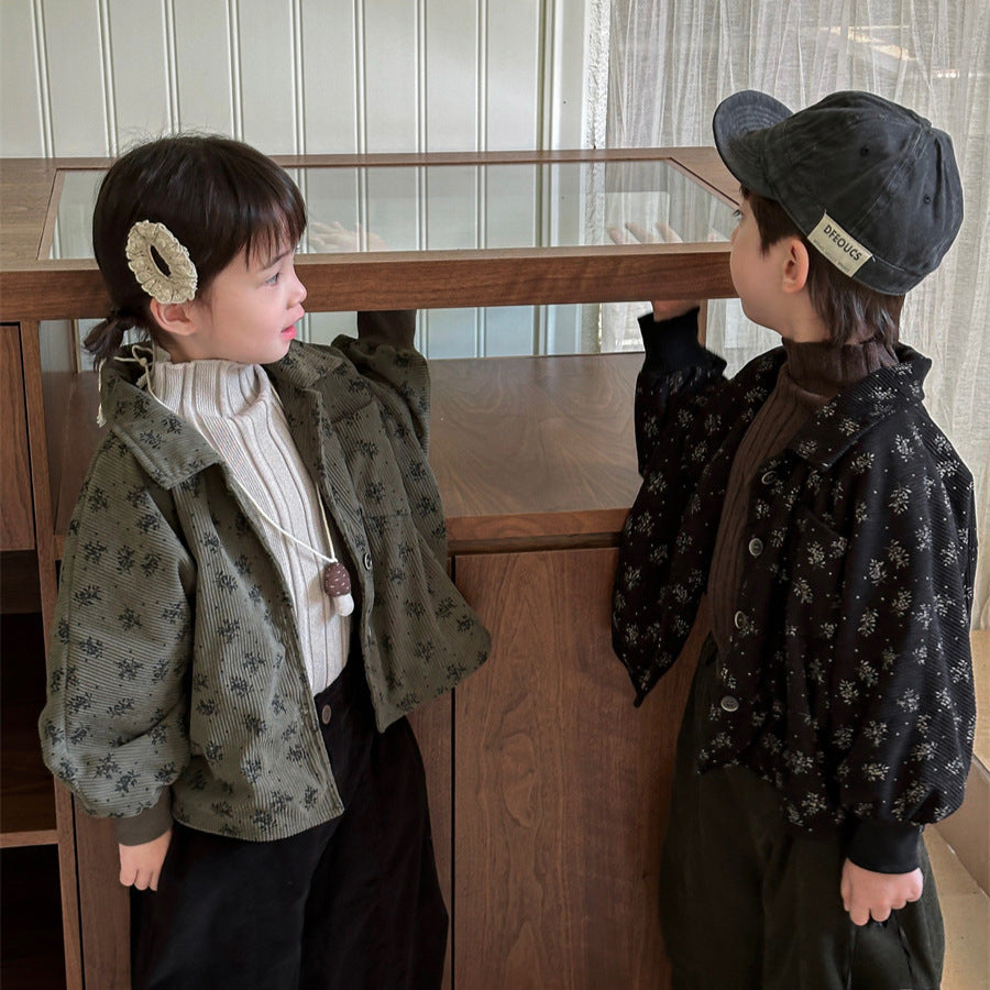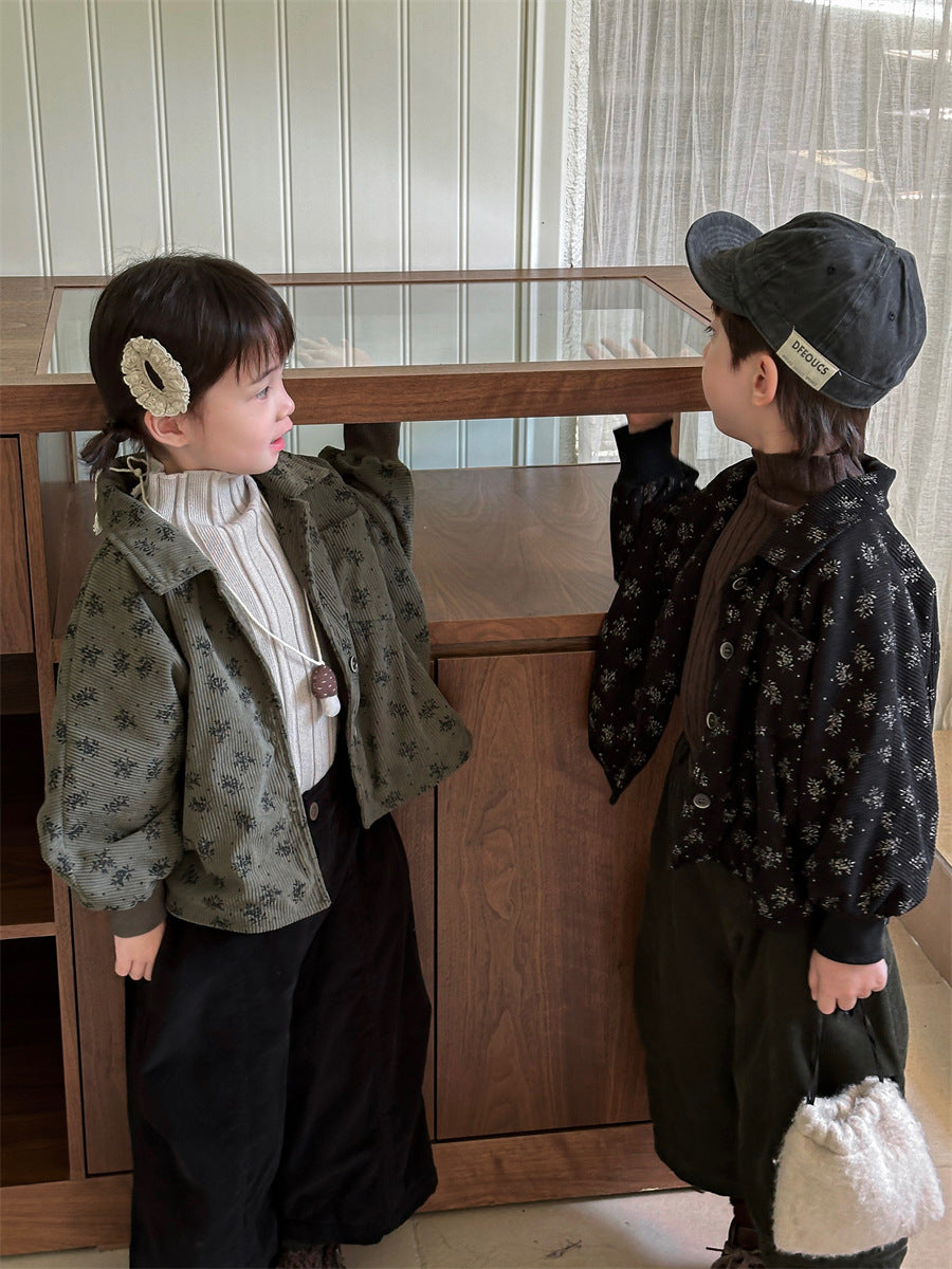 あたたかみのあるコーデュロイ素材を使用した裏起毛花総柄ジャケット。