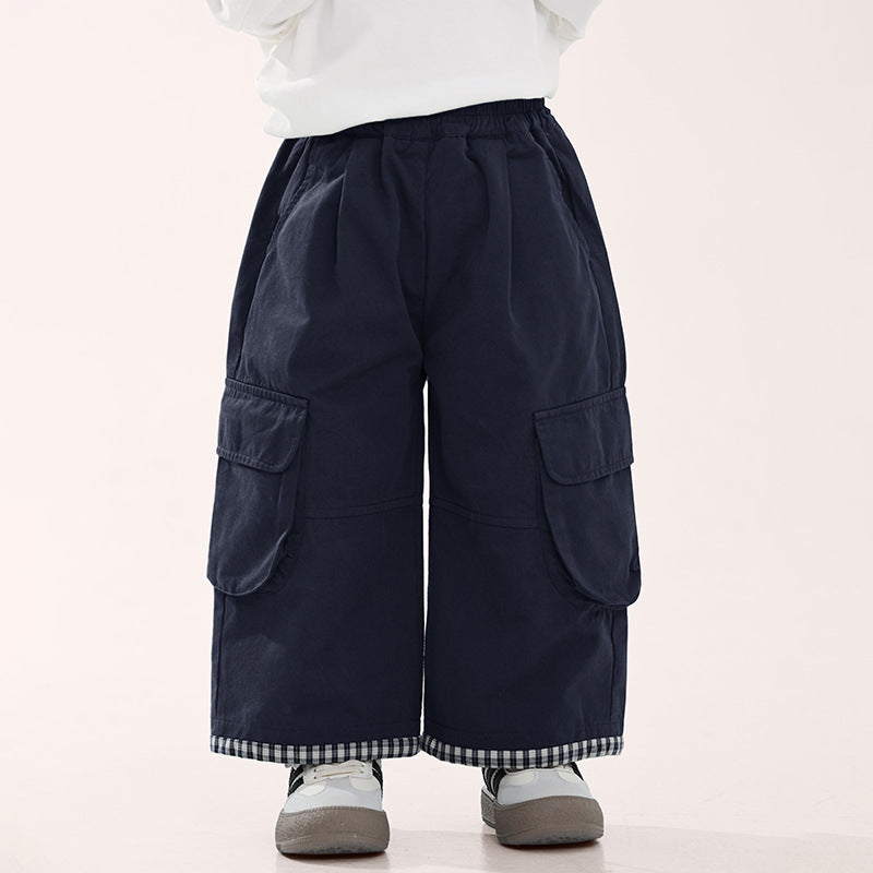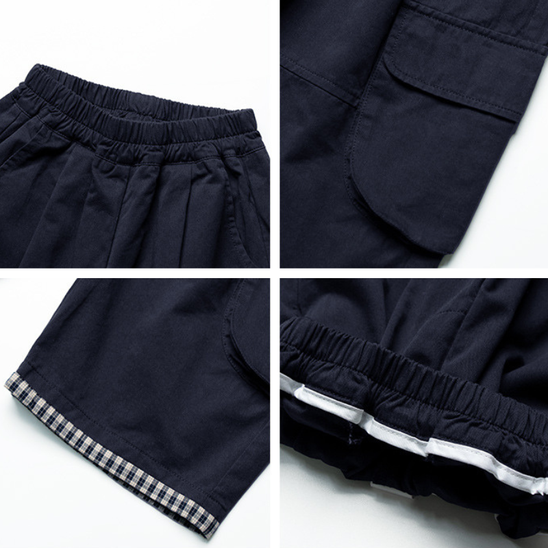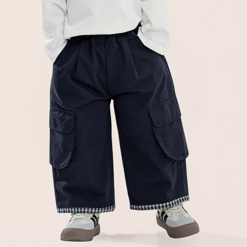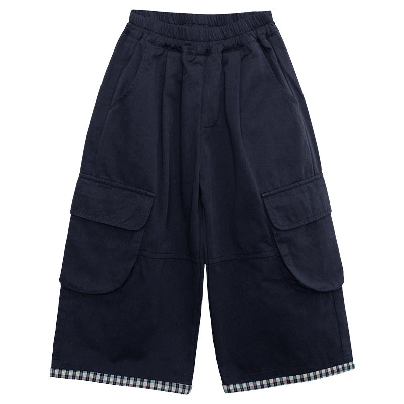 シックな濃紺カラーに、裾のチェック切り替えが遊び心を添えるカーゴパンツです。