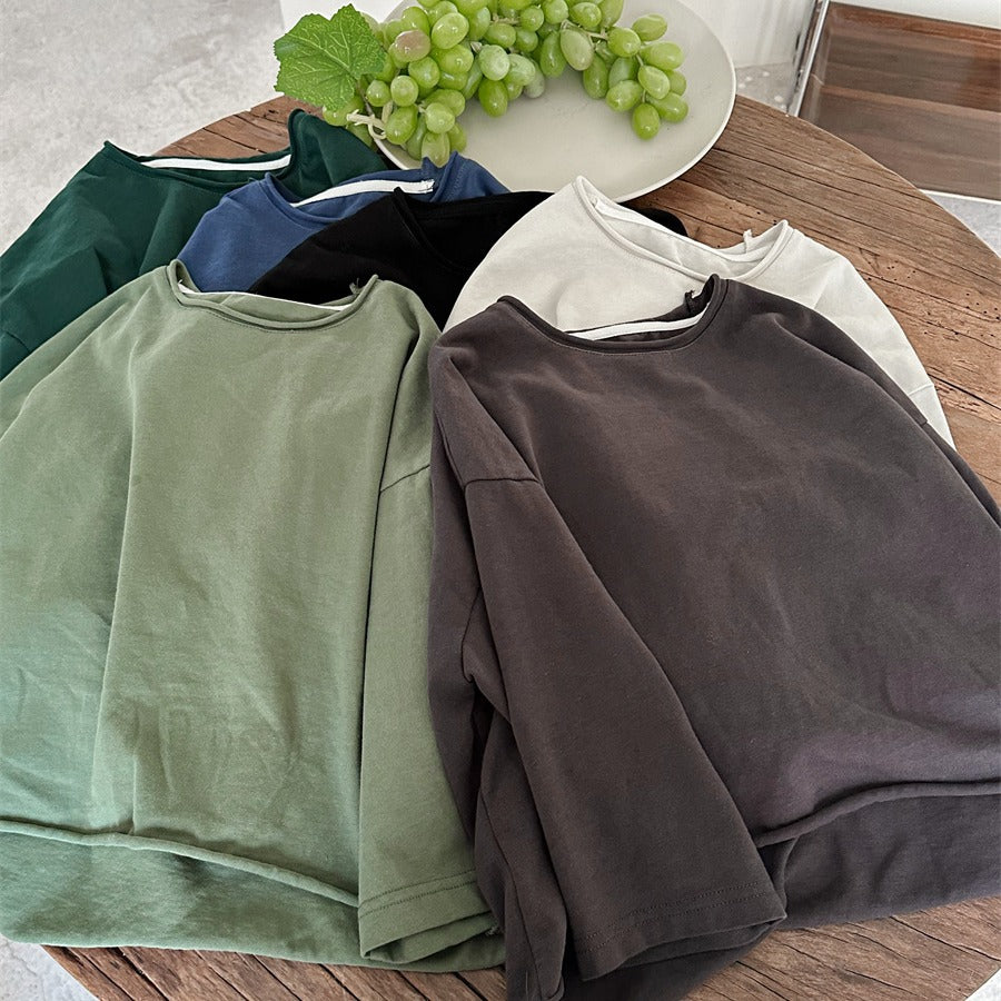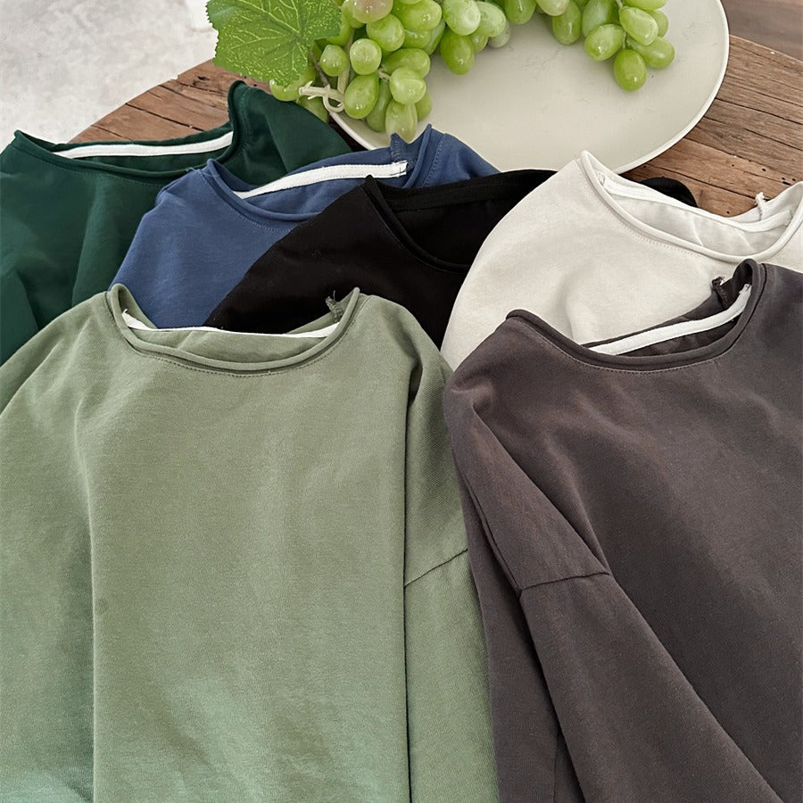 シンプルながらも、首元と裾のデザインがおしゃれな印象に。
