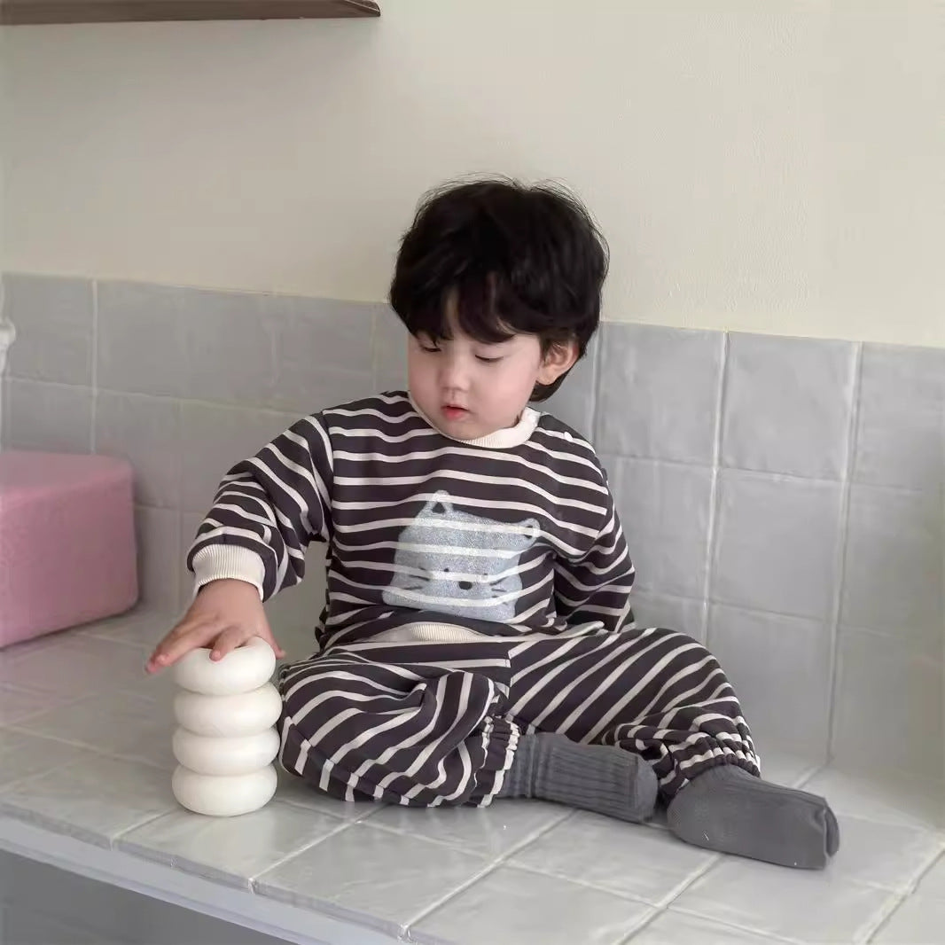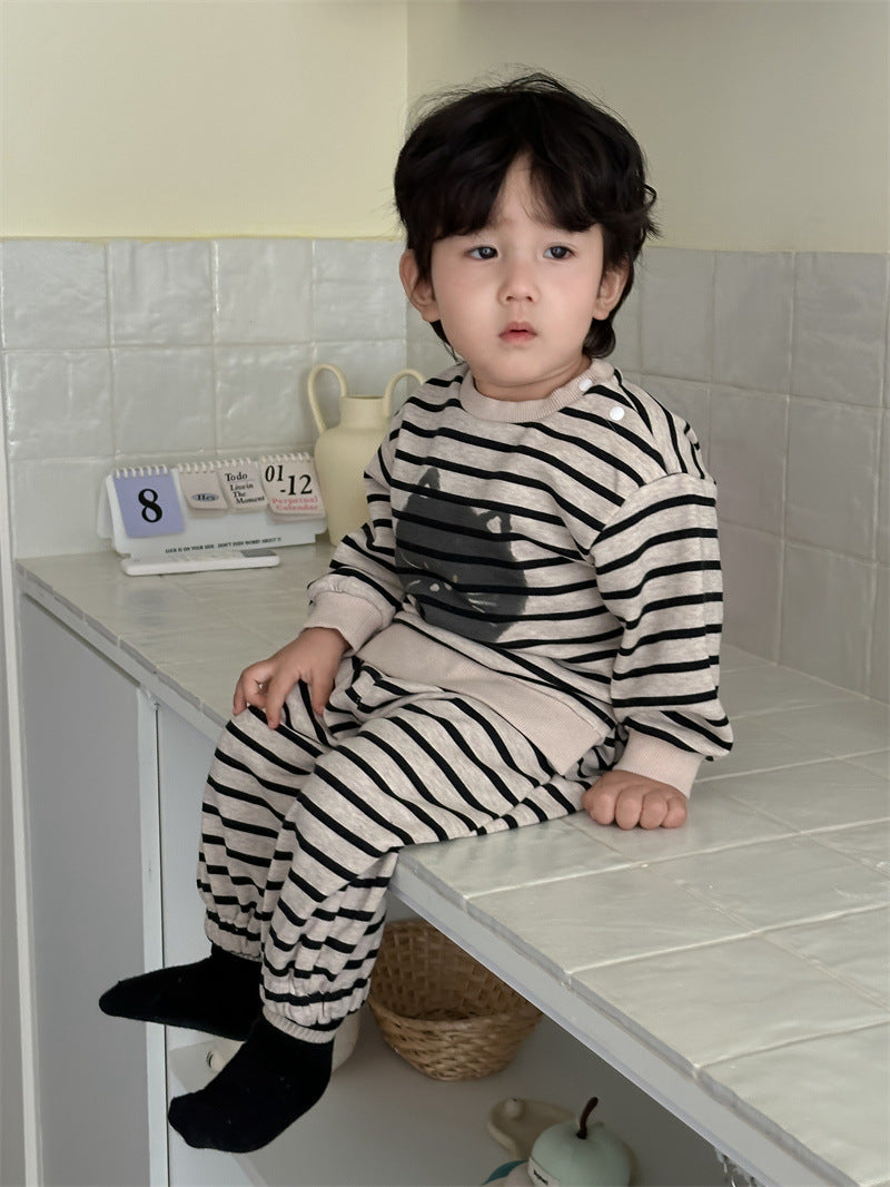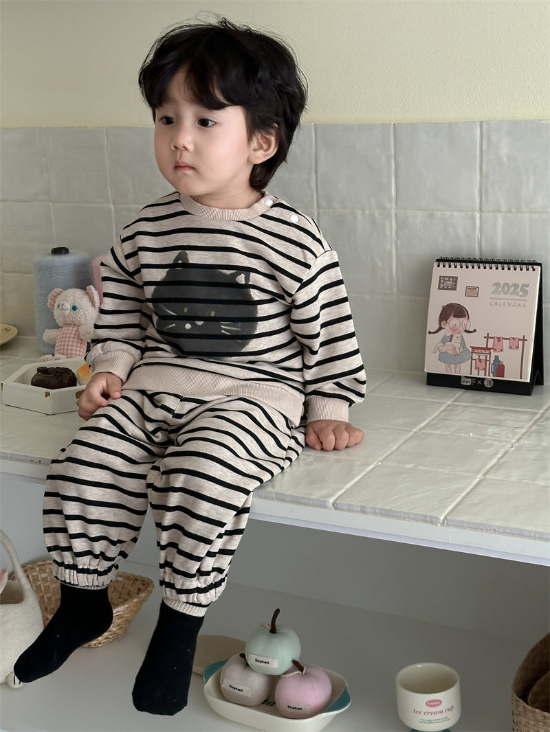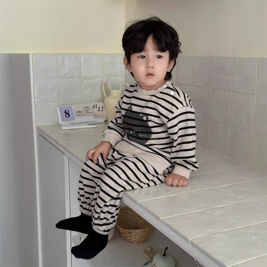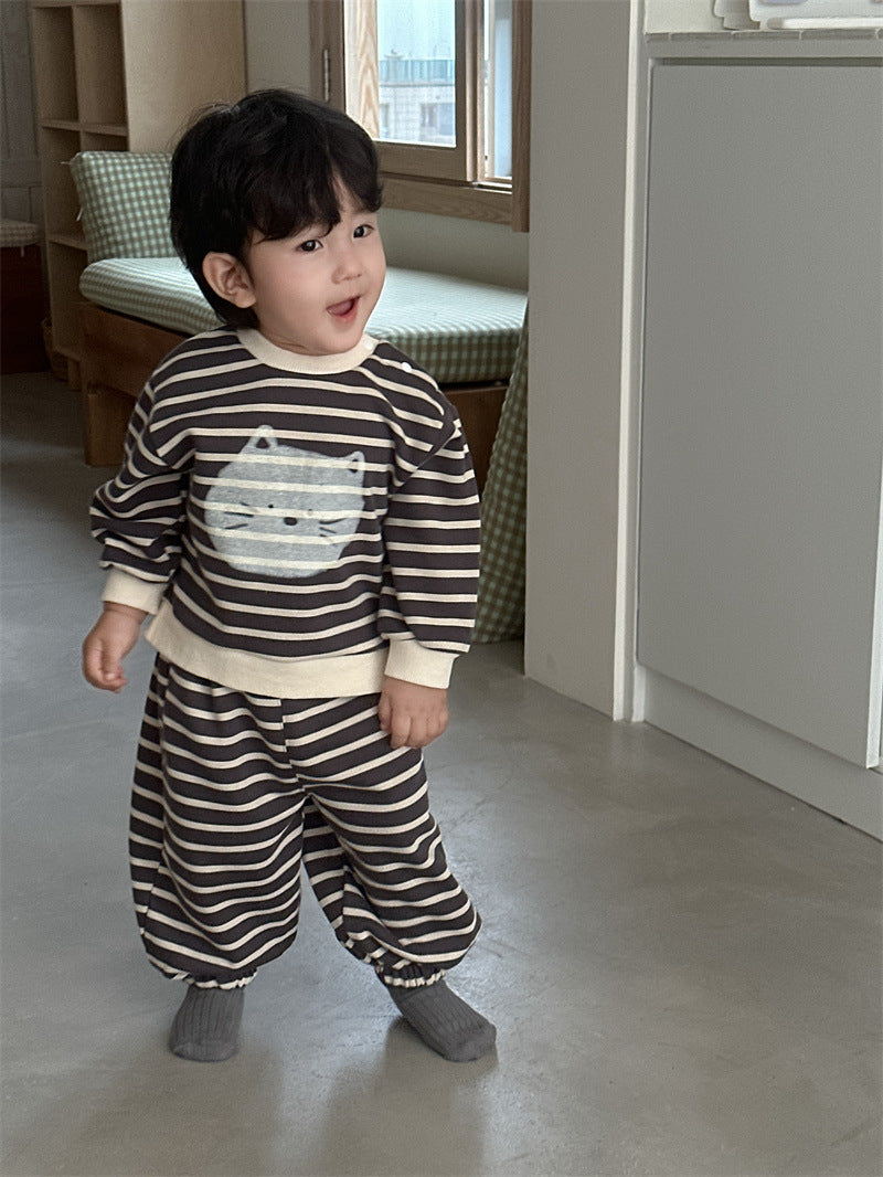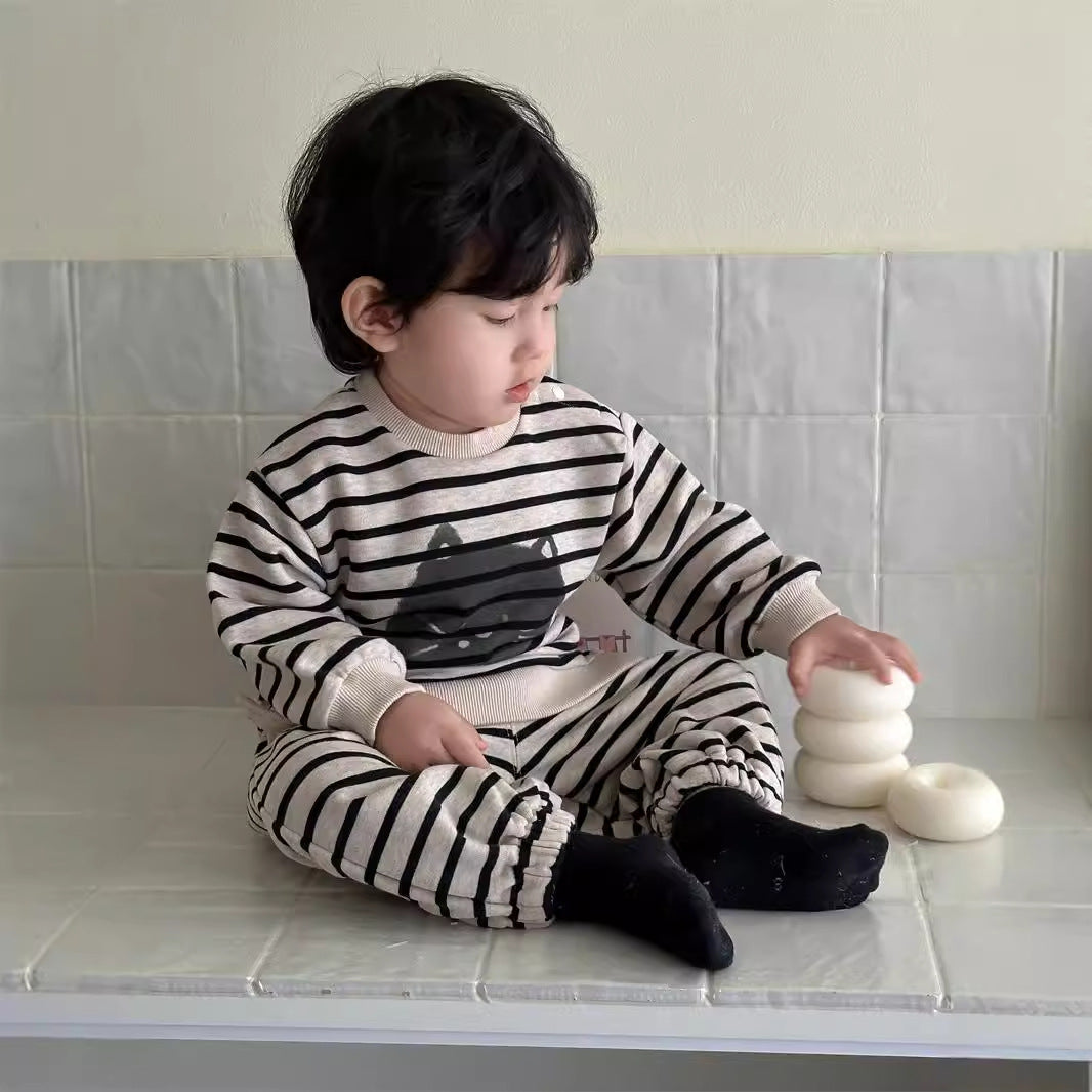 フロントに可愛いアニマルモチーフをプリントされたボーダー柄スウェットセット。