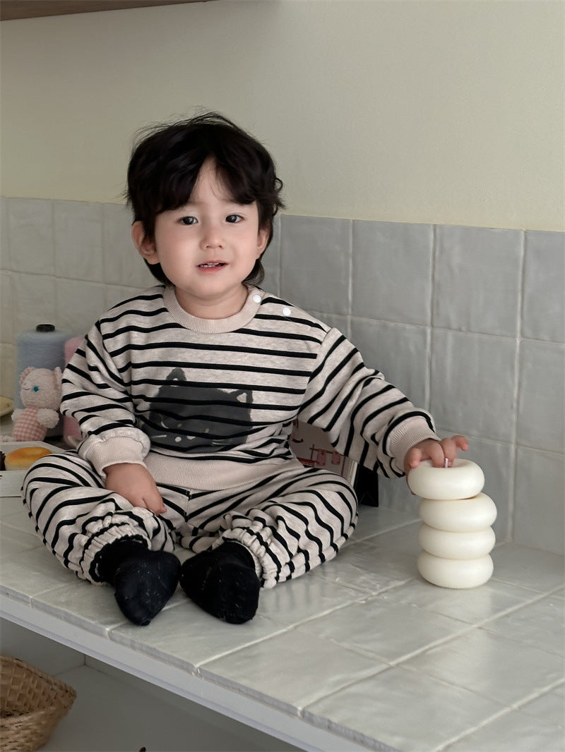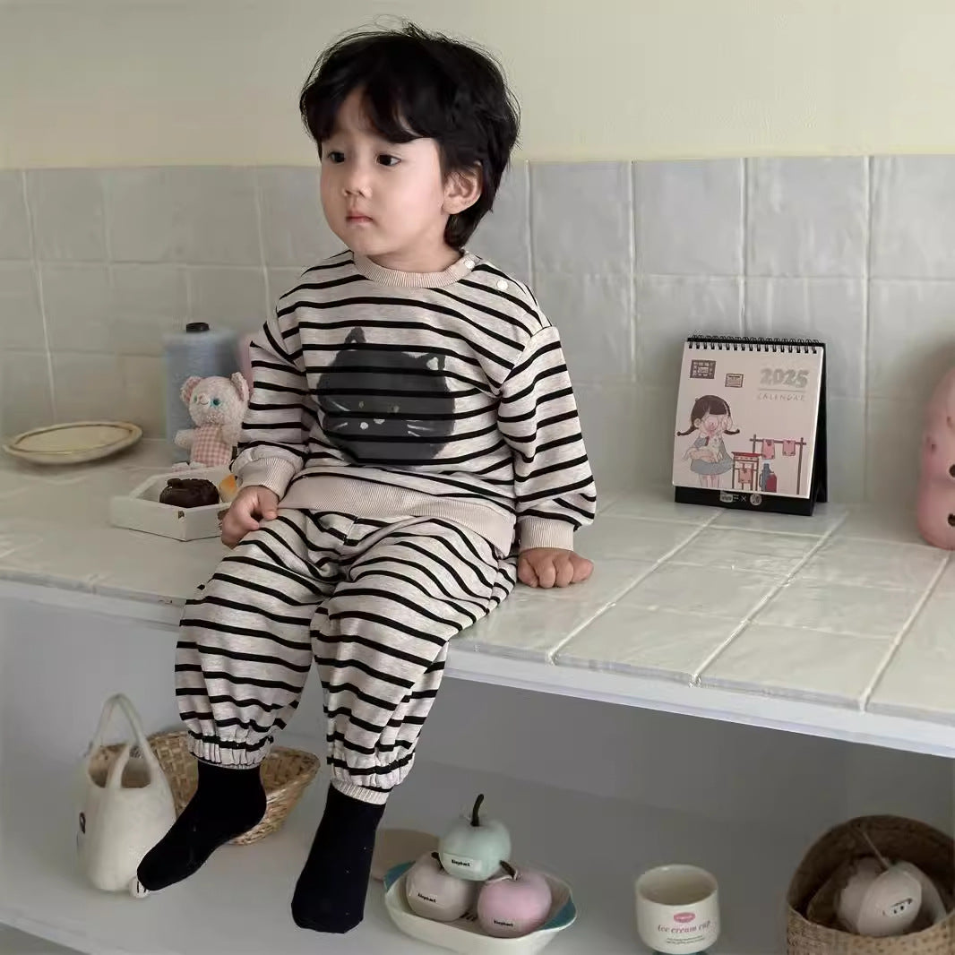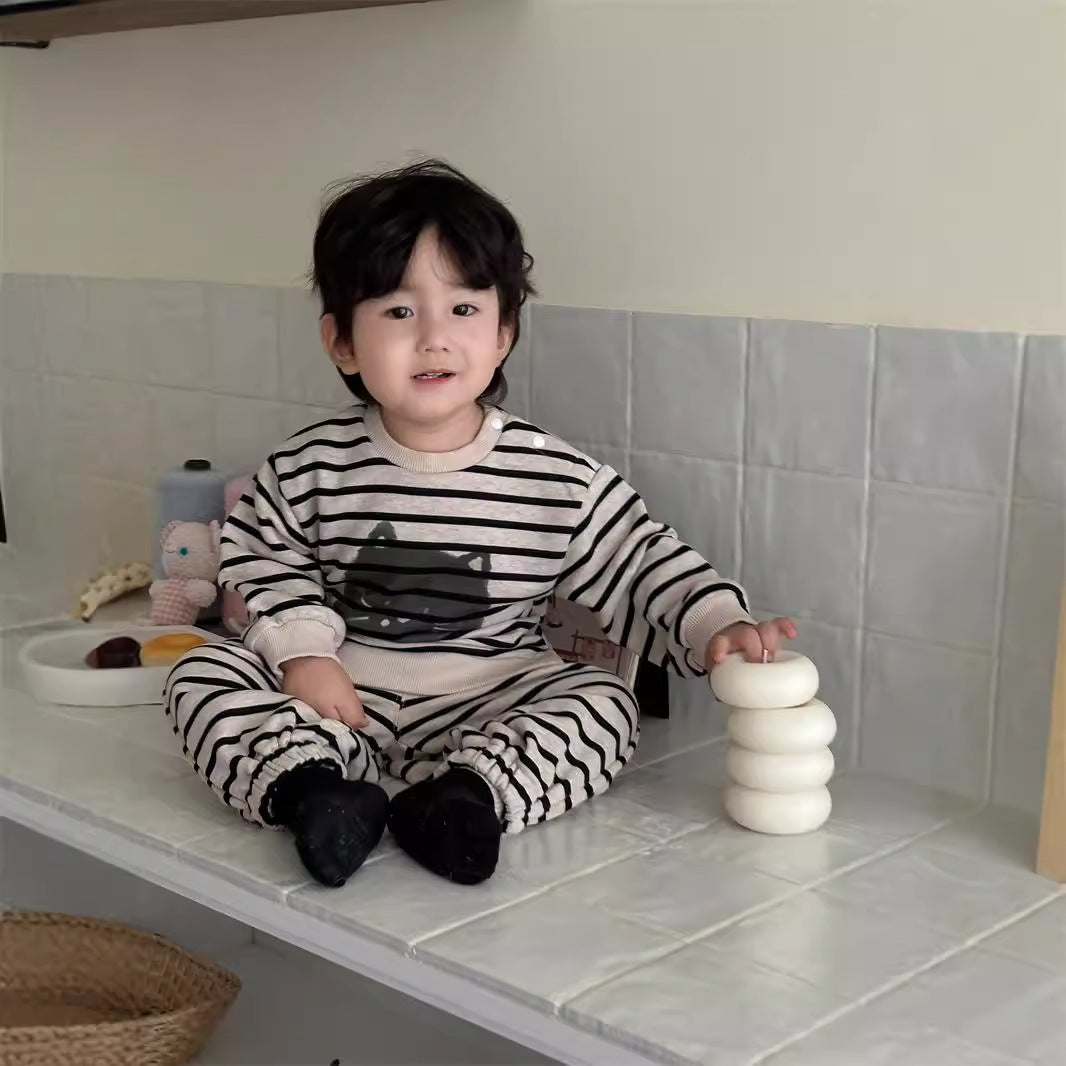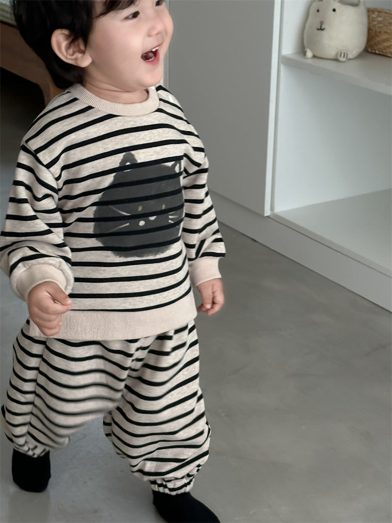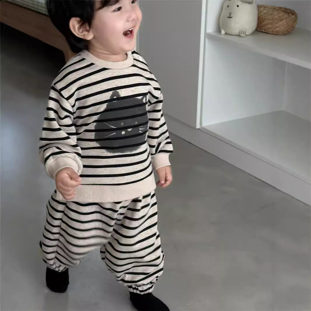 フロントに可愛いアニマルモチーフをプリントされたボーダー柄スウェットセット。