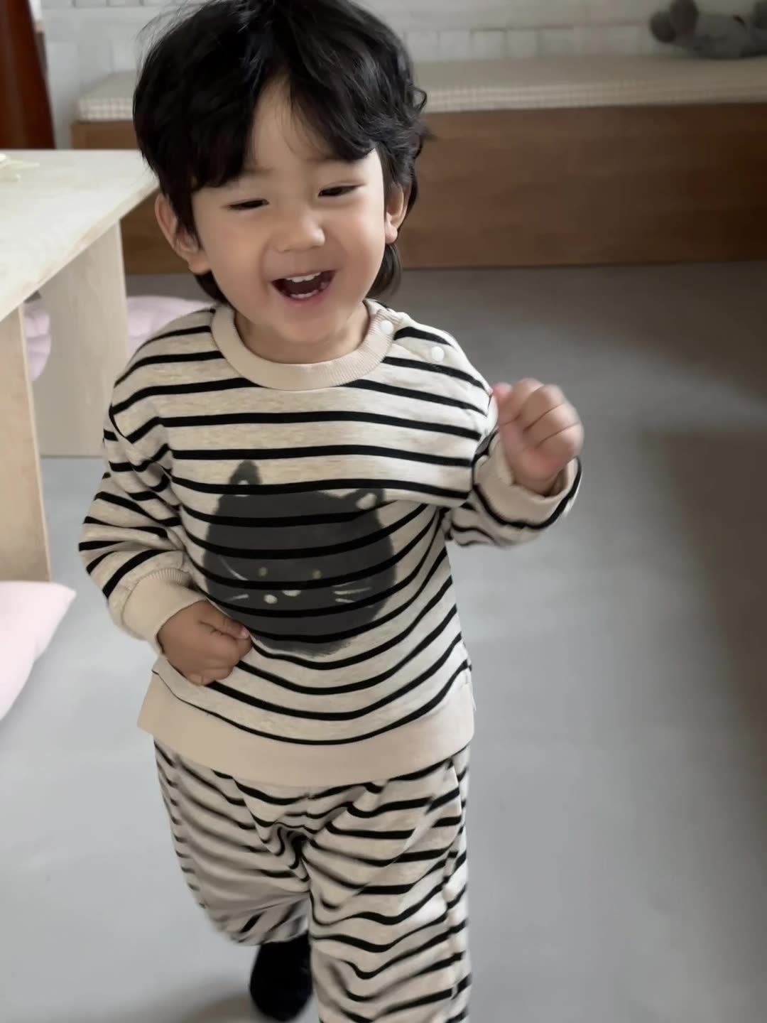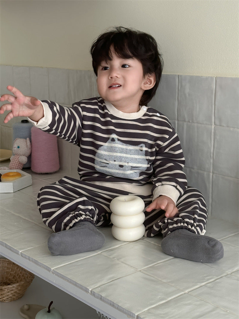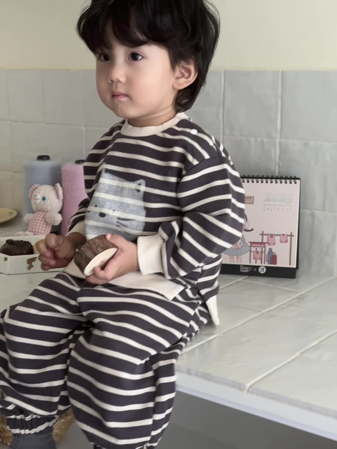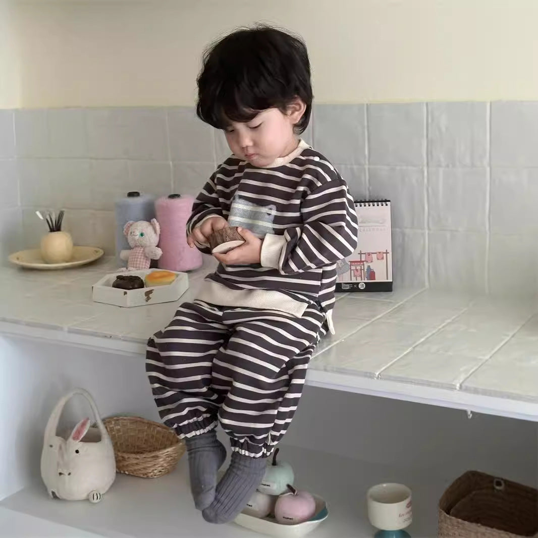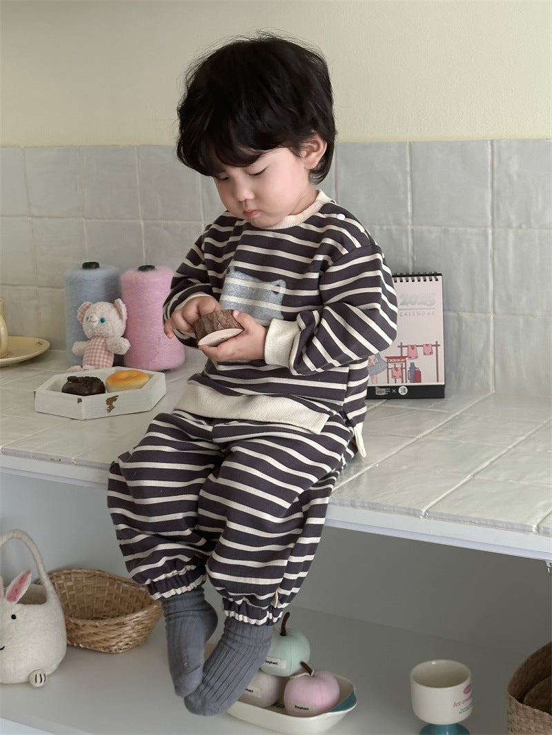 フロントに可愛いアニマルモチーフをプリントされたボーダー柄スウェットセット。